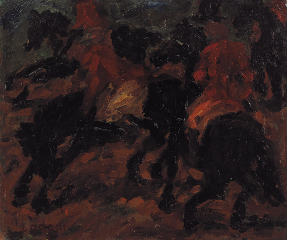 ARNALDO BADODI Milano 17/03/1913 - Disperso In Russia 1943 Caccia alla volpe, 1940 olio su cartone cm. 25x30, firma in basso a sinistra, dichiarazione di Aligi Sassu al retro che cita: "Opera autentica di Arnaldo Badodi regalatami nel 1940".