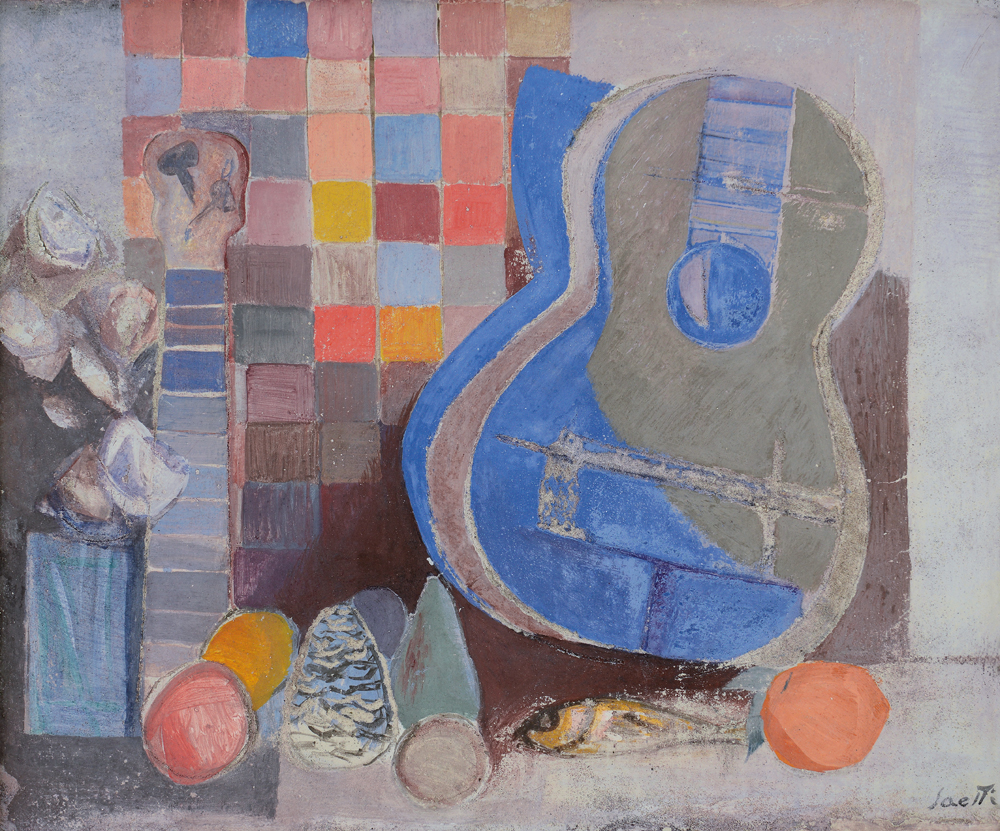 BRUNO SAETTI Bologna 21/02/1902 - Bologna 10/07/1984 Senza titolo, 1974 affresco su tela cm. 67,5x81, firma in basso a destra, firma, anno e tecnica al retro, dichiarazione d'autenticità a cura di Maria Luisa Frisa e timbro della Galleria Marconi (Forte dei Marmi) su foto.