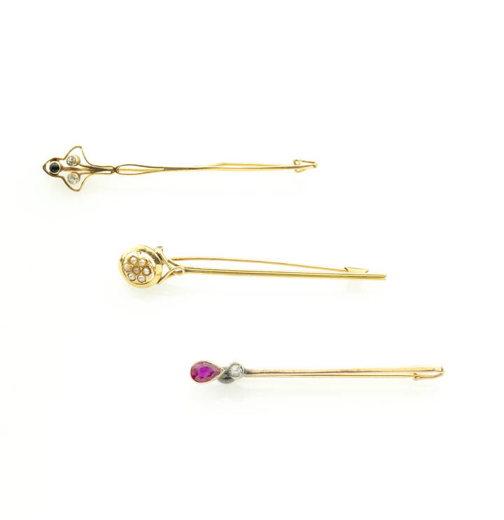 in oro giallo, di varie forme e misure con perline, zaffiiri blu, rosette e rubino
