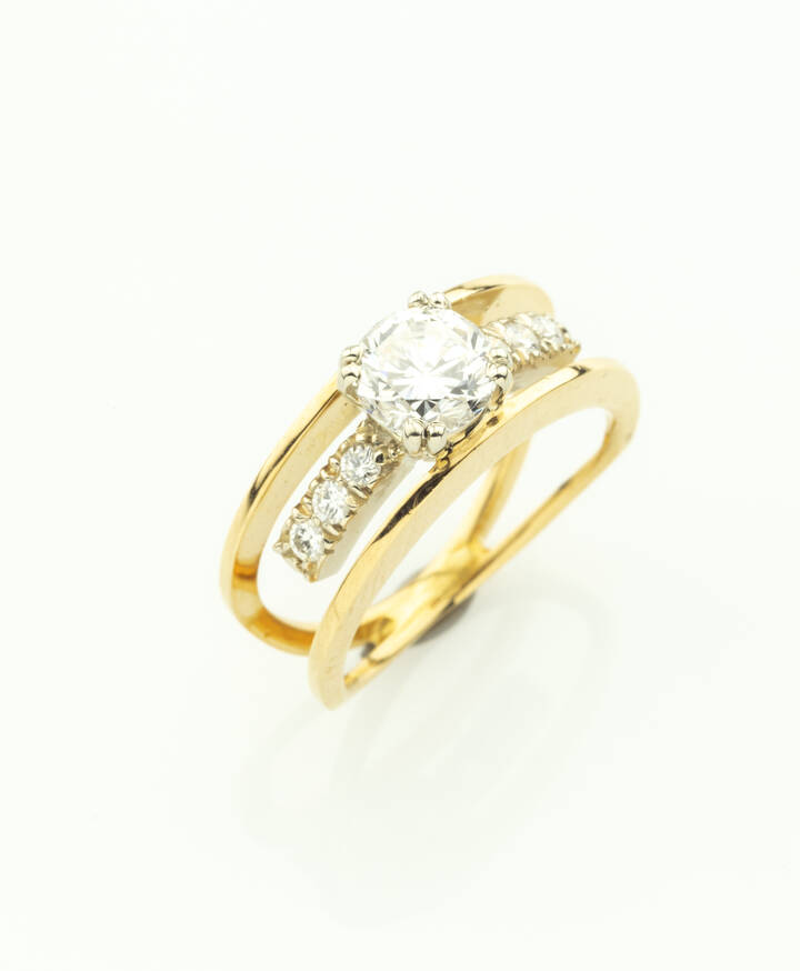 Anello in oro giallo, al centro diamante solitario taglio brillante di ct 0,78 ca, probabile colore H purezza VS2, ai lati diamanti taglio brillante per totali ct 0,12 ca.