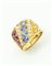 in oro giallo, a fascia, con file alternate di diamanti taglio brillante per totali ct 0,36 ca, probabile colore G-H, purezza IF-VVS, zaffiri taglio ovale di colore giallo e blu per totali ct 3,0, rubini taglio ovale per complessivi ct 1,20 ca