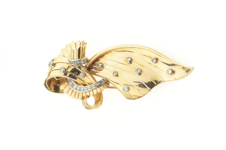 in oro rosa, anni '40, a forma di voluta con diamanti taglio 8/8 per totali ct 0,30 ca