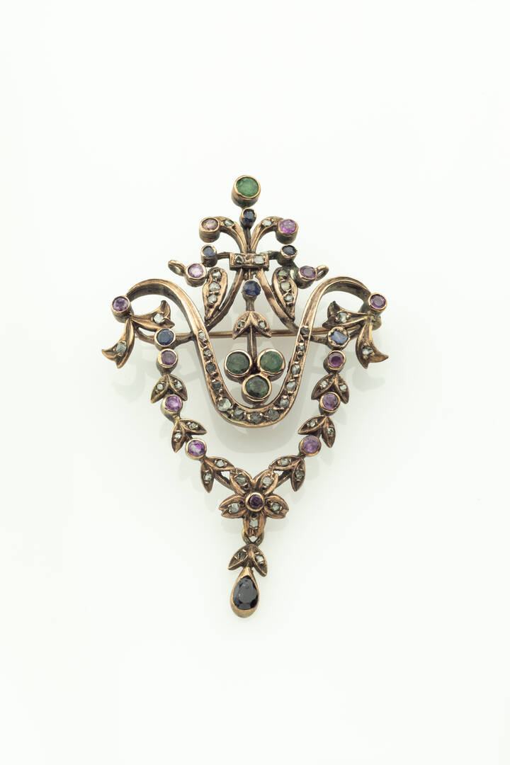 in argento ed oro a bassa caratura, XIX secolo, con festone mobile, impreziosita da rosette di diamanti, rubino, zaffiri e smeraldi taglio rotondo