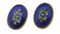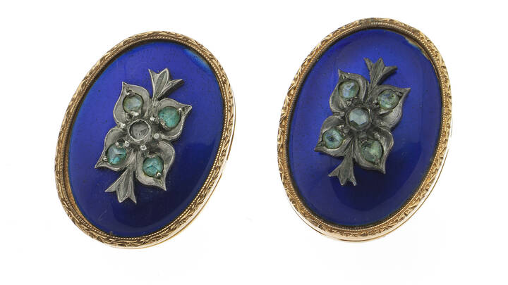 in oro giallo ed argento dorato, a clip, di forma ovale, con smalto blu e decoro floreale al centro in rosette di diamanti