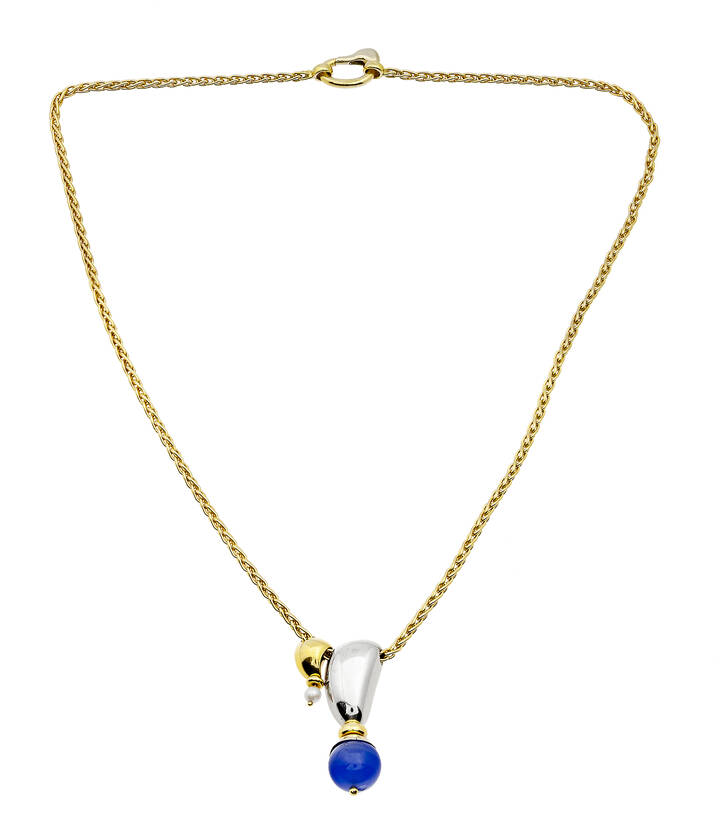in oro giallo e bianco, lavorata a maglia veneziana, terminante con sfera di agata blu (piccola scheggiatura)