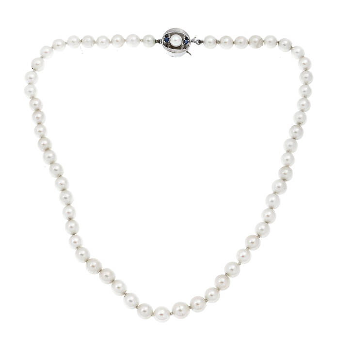 composto da un filo di perle giapponesi del diam di mm 6 e 6,5. Chiusura in oro bianco con perla e due zaffiri taglio rotondo