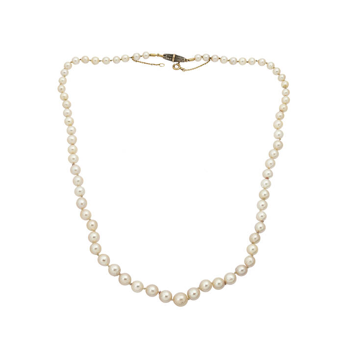 composto da un filo di perle giapponesi a scalare dal diam di mm 5,2 a 8,2. Chiusura in oro giallo e bianco a barilotto