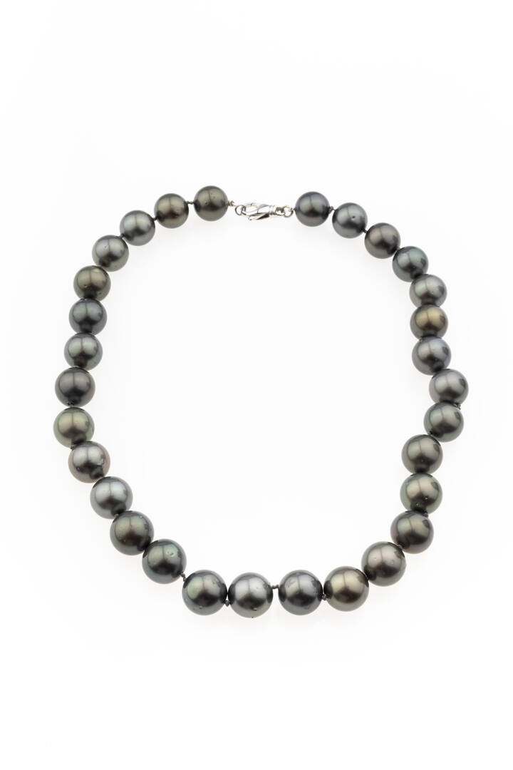 composto da un filo di perle Tahiti dal diam di mm 13 e 14. Chiusura in oro bianco a moschettone