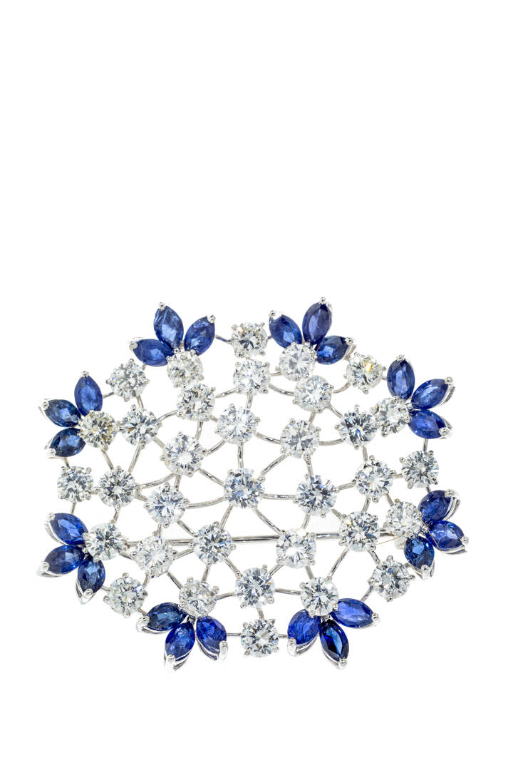 in oro bianco, di forma ovale, con diamanti taglio brillante per totali ct 7,0 ca, probabile colore G-H, purezza IF-VVS e zaffiri taglio navette per totali ct 3,50 ca