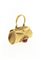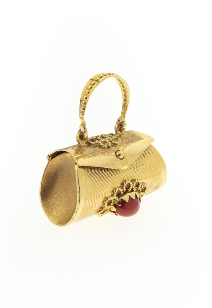 in oro giallo lucido e satinato, a forma di borsetta, impreziosita da due ovali in vetro rosso