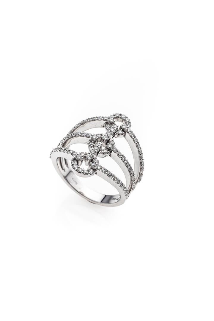 in oro bianco, sommità composta da tre fili raccordati al centro tra tre cerchi, interamente in diamanti taglio brillante per totali ct 0,92 ca, probabile colore G-H, purezza IF-VVS