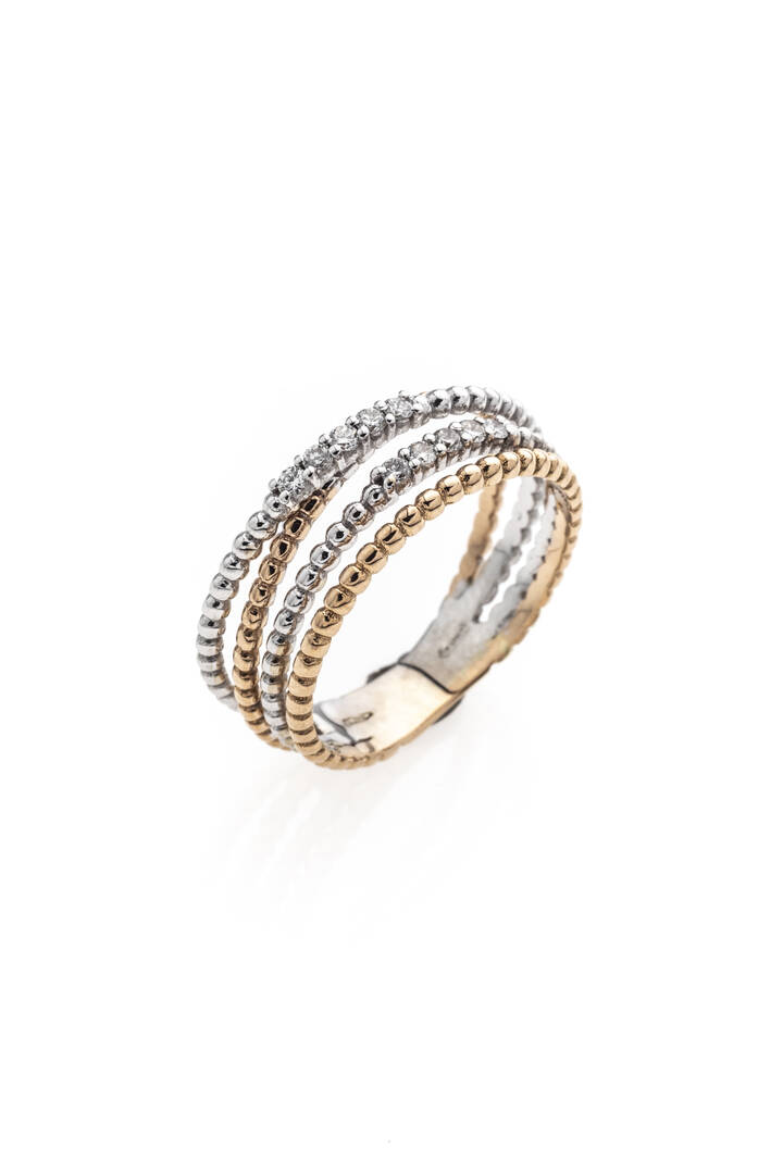 in oro rosa e bianco, composto da quattro fasce lavorate a corda intrecciate; piccoli diamantini taglio brillante a decoro per totali ct 0,10 ca