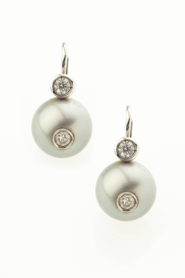 in oro bianco, a monachella, con due perle Tahiti del diam di mm 12 ca e al centro quattro diamanti taglio brillante per totali ct 0,40 ca