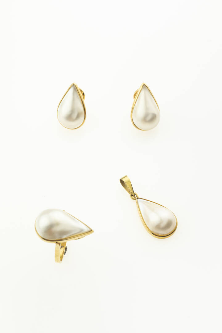 in oro giallo composta da: coppia di orecchini, a clip, anello e ciondolo con perle mabé a goccia