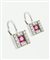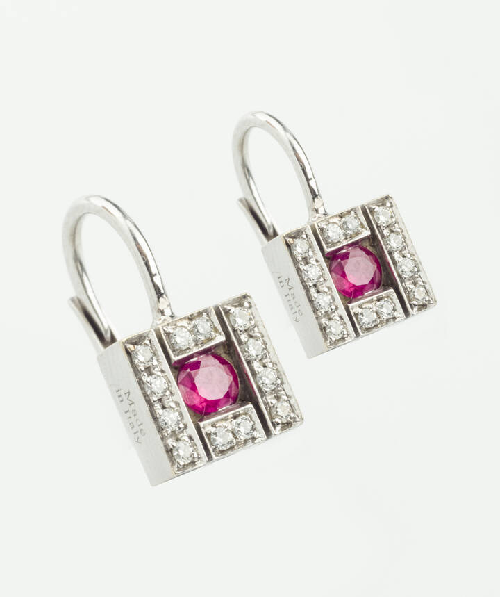 Coppia di orecchini in oro bianco, a monachella, firmati "Damiani", con due quadrati in diamanti taglio brillante per totali ct 0,16 ca ed al centro due rubini taglio rotondo per totali ct 0,30 ca