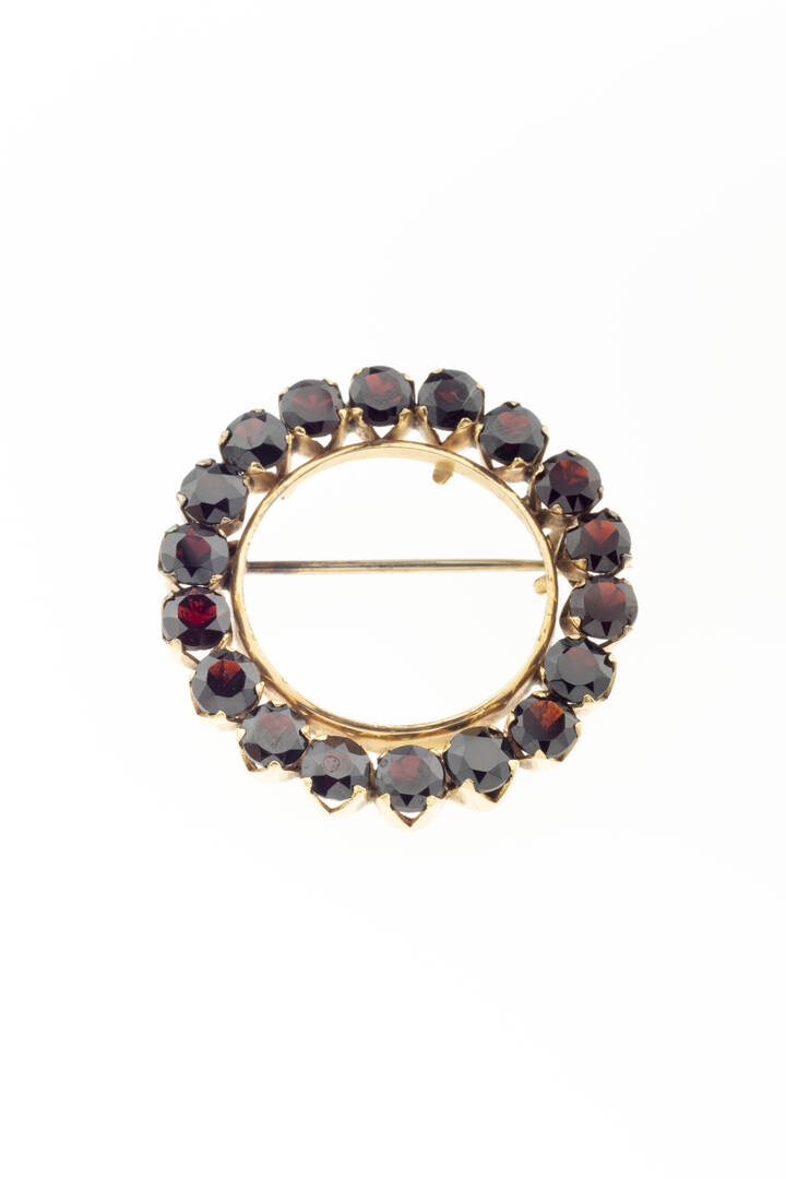 in oro giallo, di forma rotonda, con fila di granati taglio rotondo