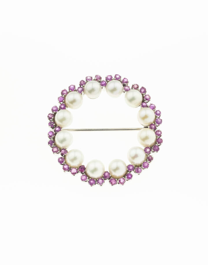 in oro bianco, di forma rotonda, con perle giapponesi del diam di mm 5,5 ca e contorno con fila di rubini taglio brillante per totali ct 1,20 ca