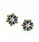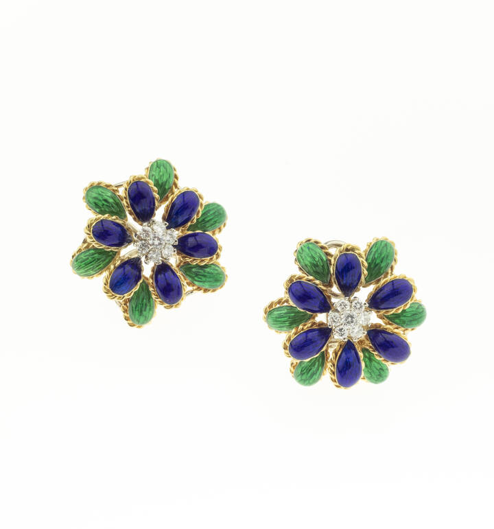 in oro giallo, anni '50, a forma di fiore con smalti blu e verdi. Piccoli diamanti a decoro per totali ct 0,30 ca. Recano il punzone "160 AL" della ditta Lunati