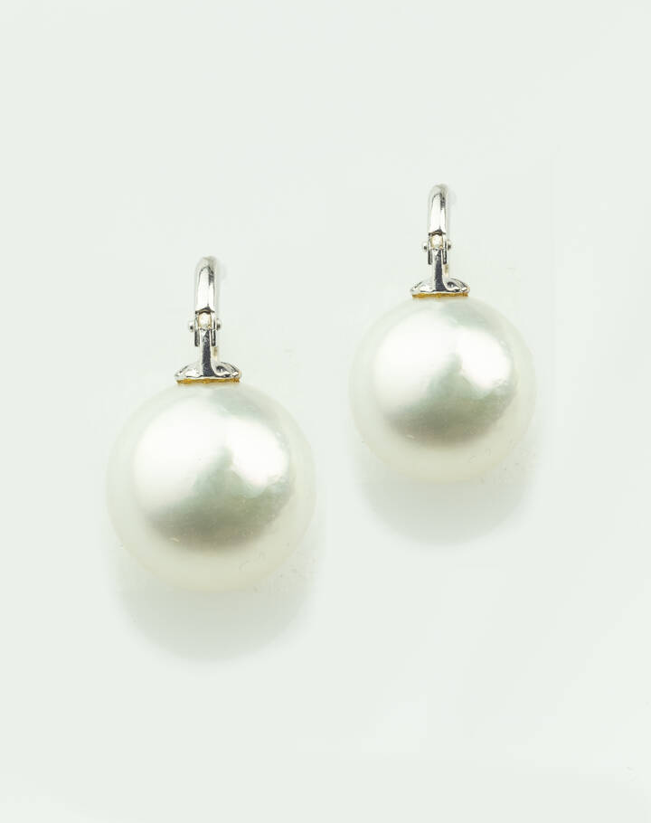 in oro bianco, a monachella, con due perle australiane del diam di mm 13,6 ca