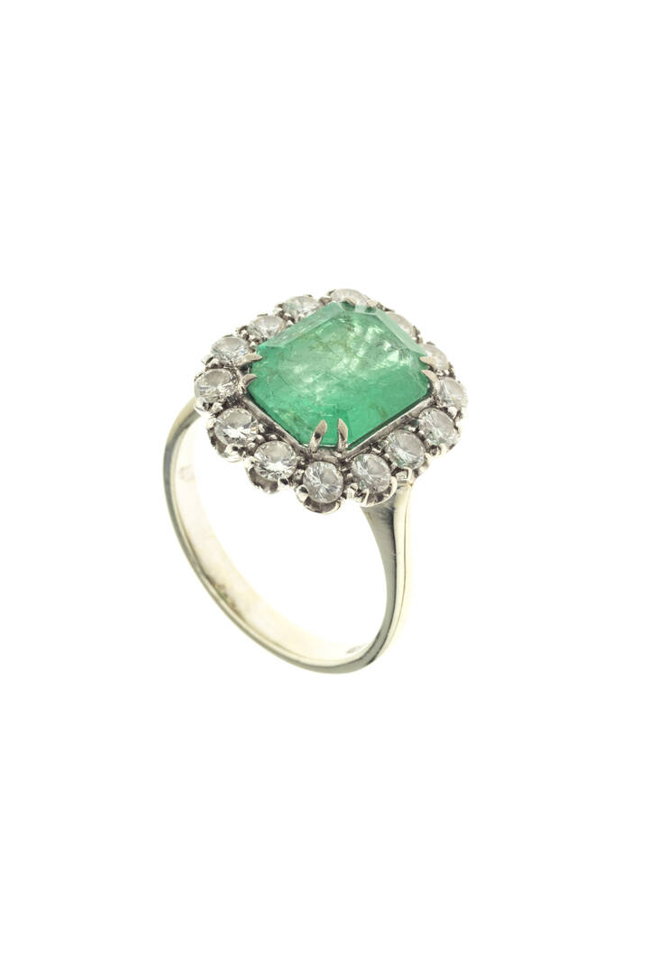 in oro bianco con al centro smeraldo taglio ottagonale a gradini di ct 2,50 ca, circondato da diamanti taglio brillante per totali ct 0,65 ca