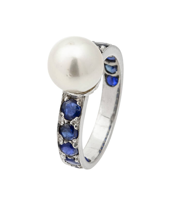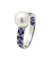 Anello in oro bianco, al centro perla giapponese del diam di mm 8 ca e ai lati zaffiri taglio rotondo per totali ct 1,0 ca. Astuccio della maison "Enrico Cirio".