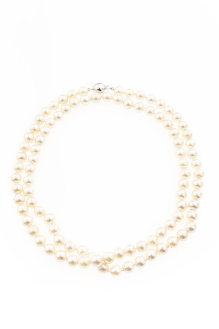 composta da un filo di perle giapponesi del diam di mm 8,5 e 9. Chiusura in oro bianco a sfera