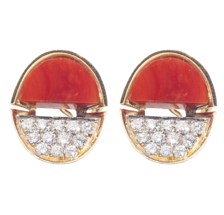 in oro rosa a bianco 9 Kt, a clip, di forma ovale leggermente concavi all'interno mezza luna in corallo rosso e mezza luna in diamanti taglio brillante per totali ct 1,25 ca