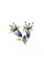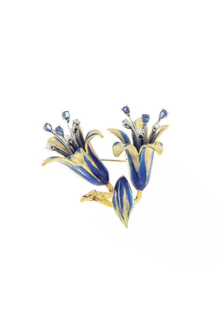 in oro giallo, con due campanule in smalto blu e bianco; piccoli diamantini taglio brillante per totali ct 0,15 ca, zaffiri taglio a goccia per totali ct 0,60 ca