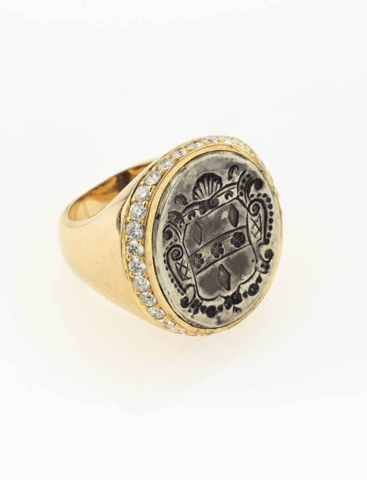 in oro rosa, sommità ovale, con al centro stemma nobiliare in argento, contornato da diamanti taglio brillante per totali ct 0,80 ca