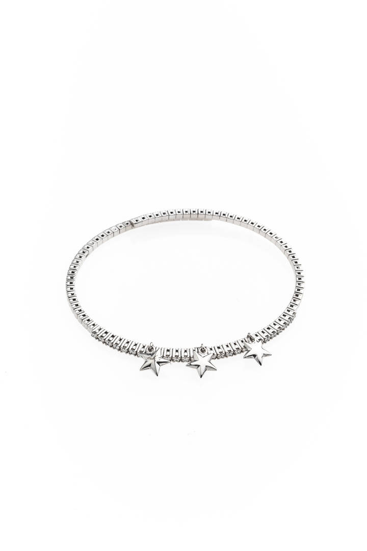 serigido, in oro bianco, al centro fila di diamanti taglio brillante per totali ct 0,73 ca, probabile colore G-H, purezza IF-VVS, con tre stelline pendenti