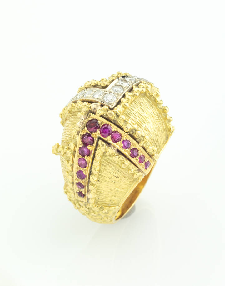 in oro giallo, sommità bombata, satinata e lavorata con inserto di rubini taglio rotondo per totali ct 0,30 ca e diamanti taglio brillante per totali ct 0,20 ca