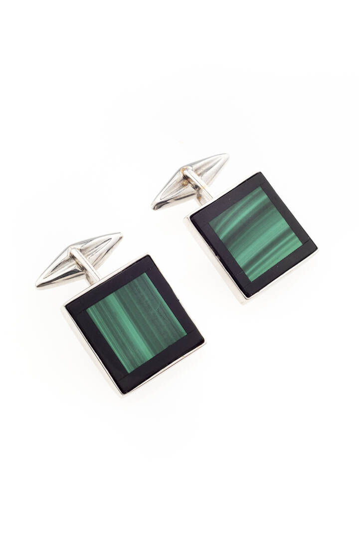 in oro bianco, di forma quadrata, con onice nero e inserto in malachite