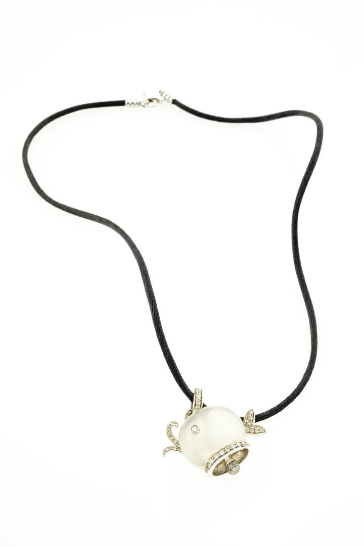 Catena in tessuto, con ciondolo a campanella a forma di pesce, in oro bianco con cristallo di rocca cabochon, firmato "Chantecler". Diamanti a decoro per totali ct 0,30 ca. Chiusura a moschettone in oro bianco