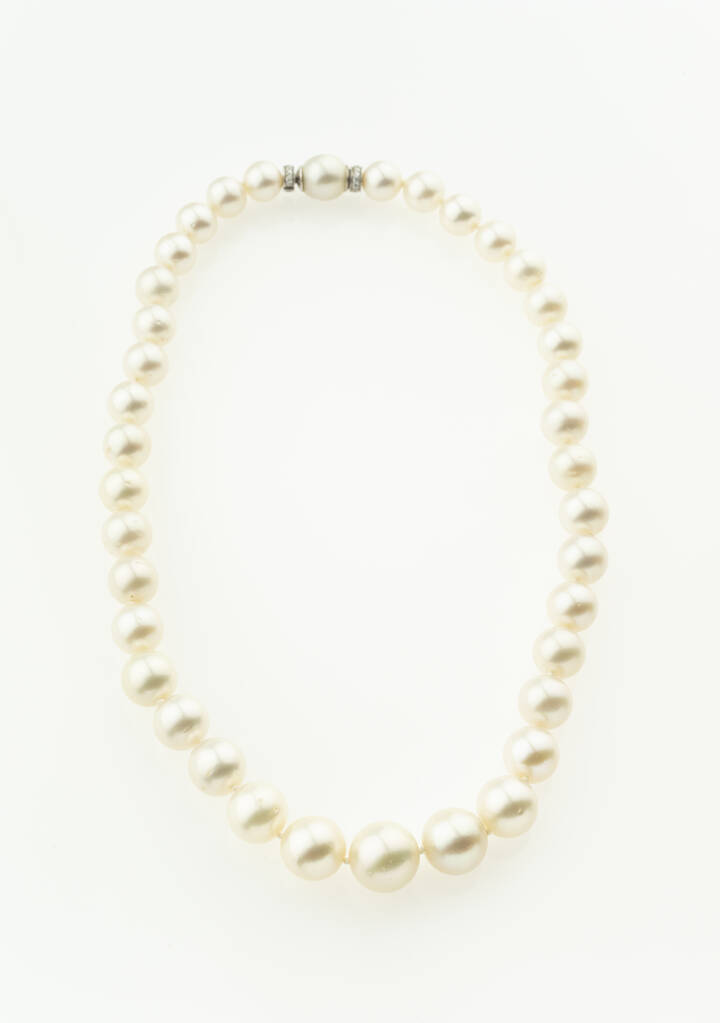 composto da un filo di perle australiane a scalare dal diam di mm 10,5 a 14,5. Chiusura in oro bianco con due rondelle di diamanti taglio brillante per totali ct 0,20 ca