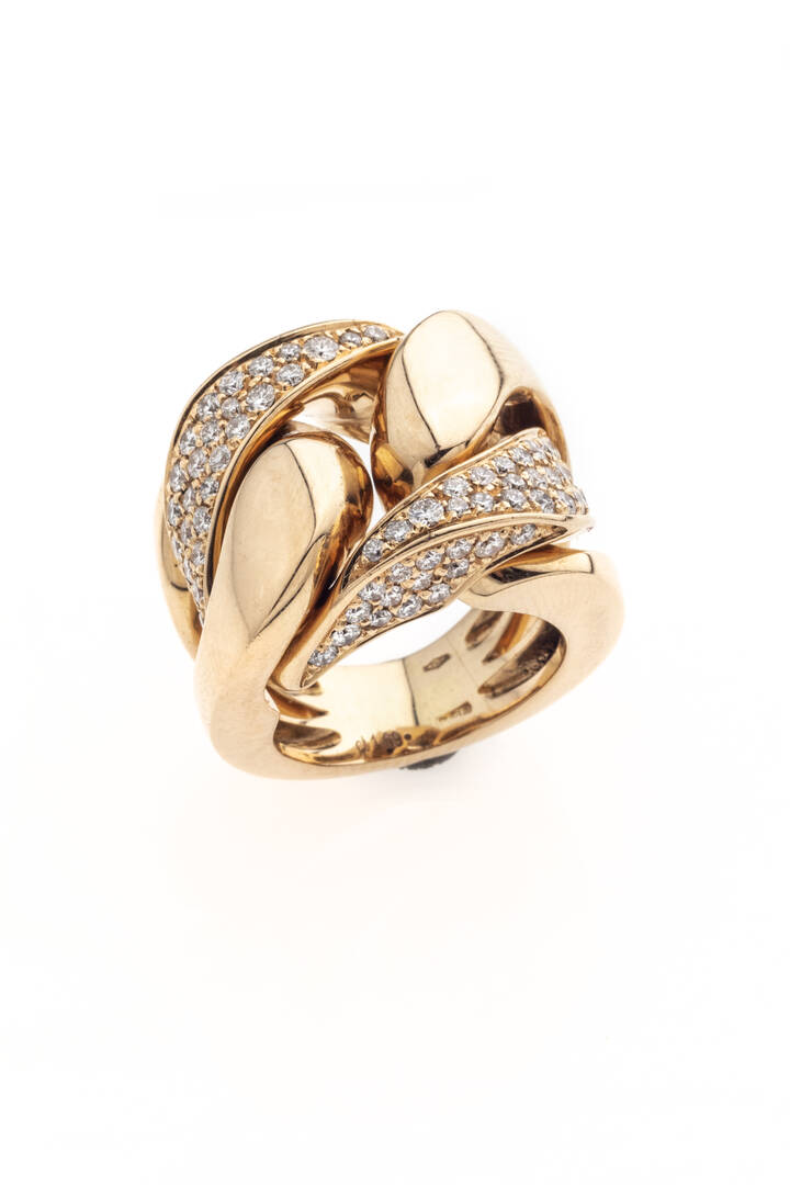 Anello in oro rosa, marcato "3130AL" ("Crivelli"), sommità geometrica lavorata a nodo, con diamanti taglio brillante per totali ct 1,69 ca, probabile colore G-H, purezza IF-VVS