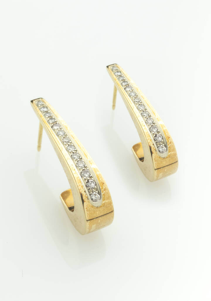 in oro giallo e bianco 14 Kt, ad amo, con diamanti taglio brillante per totali ct 0,25 ca