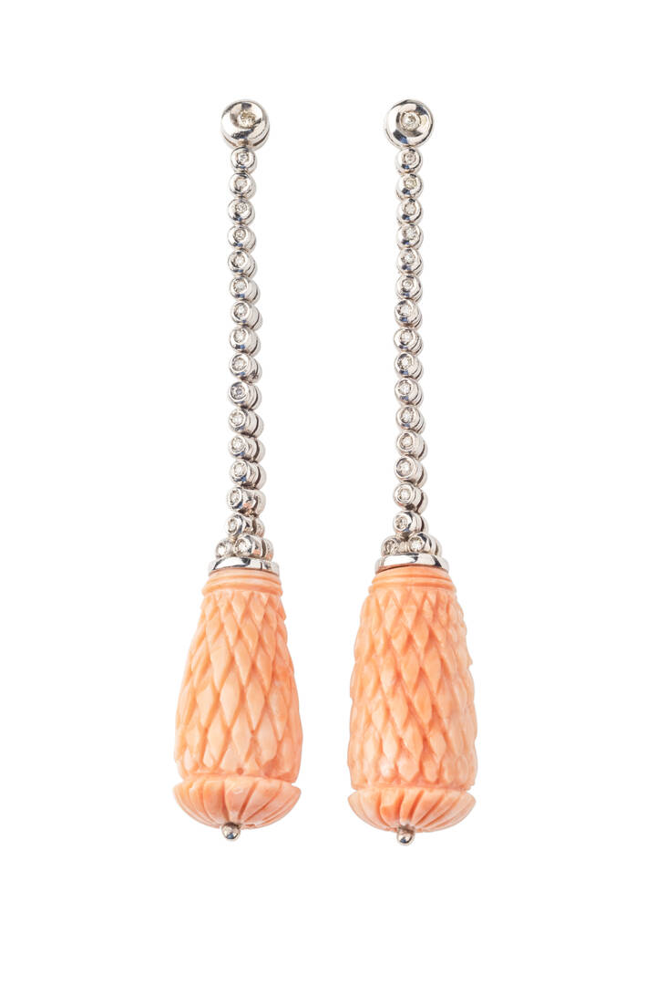 in oro bianco 14 Kt, corpo modello tennis con diamanti taglio 8/8 e brillante per totali ct 0,36 ca, terminanti con pigne in corallo rosa