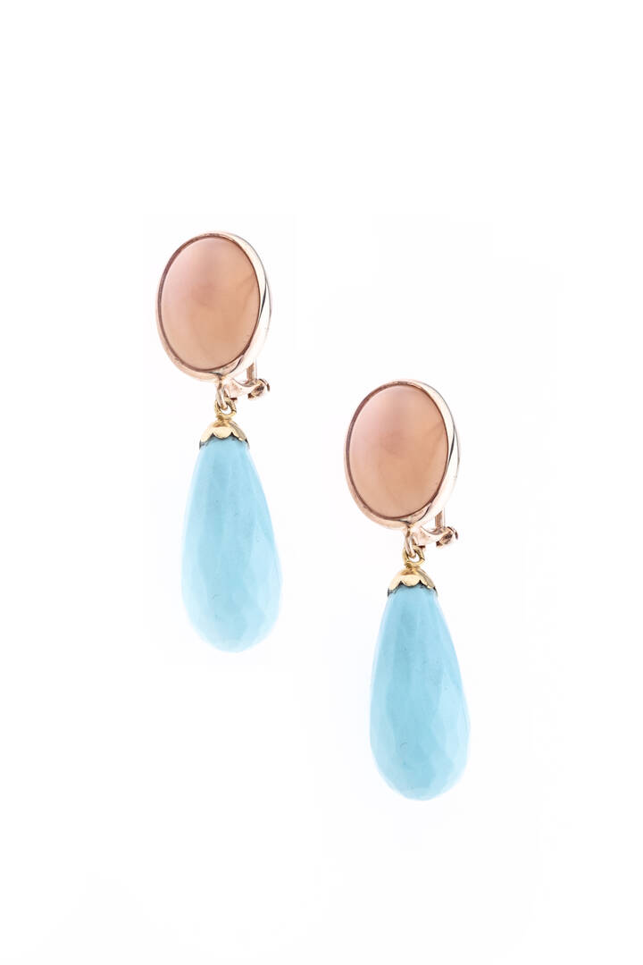 pendenti, in oro rosa e giallo, con pietre ovali cabochon e terminanti con gocce sfaccettate di pasta di turchese