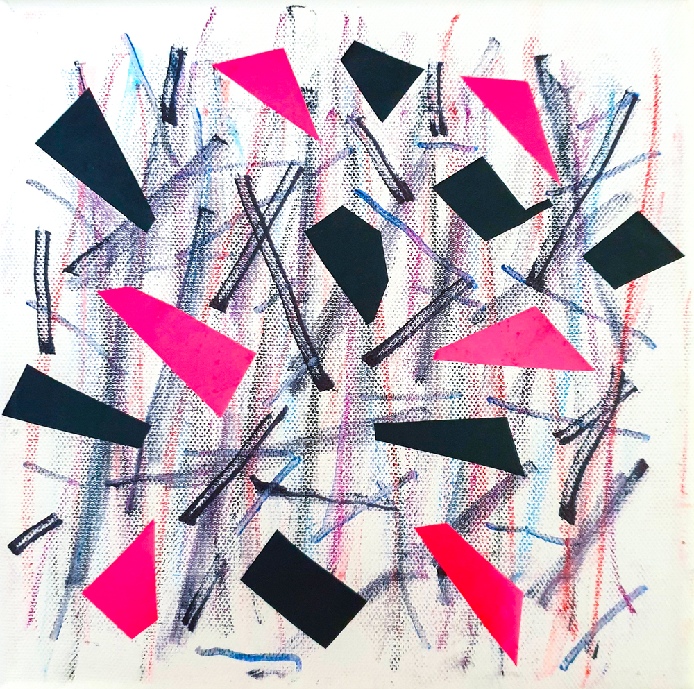 Acrilico e collage su tela 20x20 cm; firma, anno e titolo al retro.