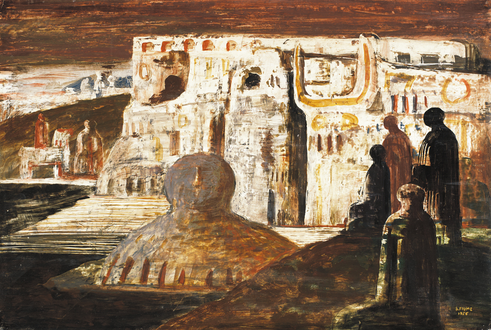 SALVATORE FIUME Comiso (Rg) 23/10/1915 - Canzo (Co) 04/06/1997 Isola di pietra, 1956 olio su cartone intelato cm. 36x54, firma e anno in basso a destra, dichiarazione d'autenticità dell'artista su foto.