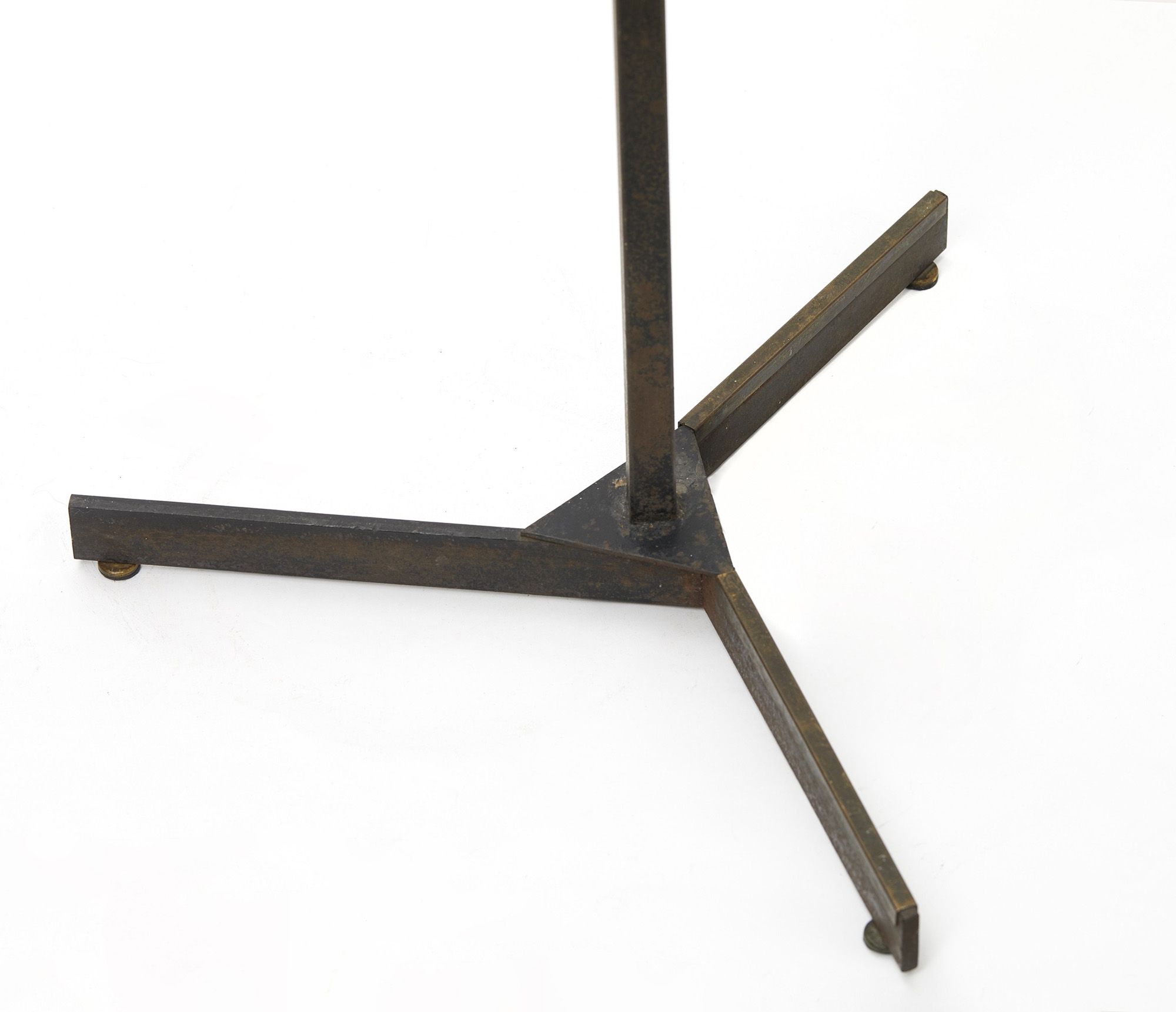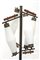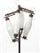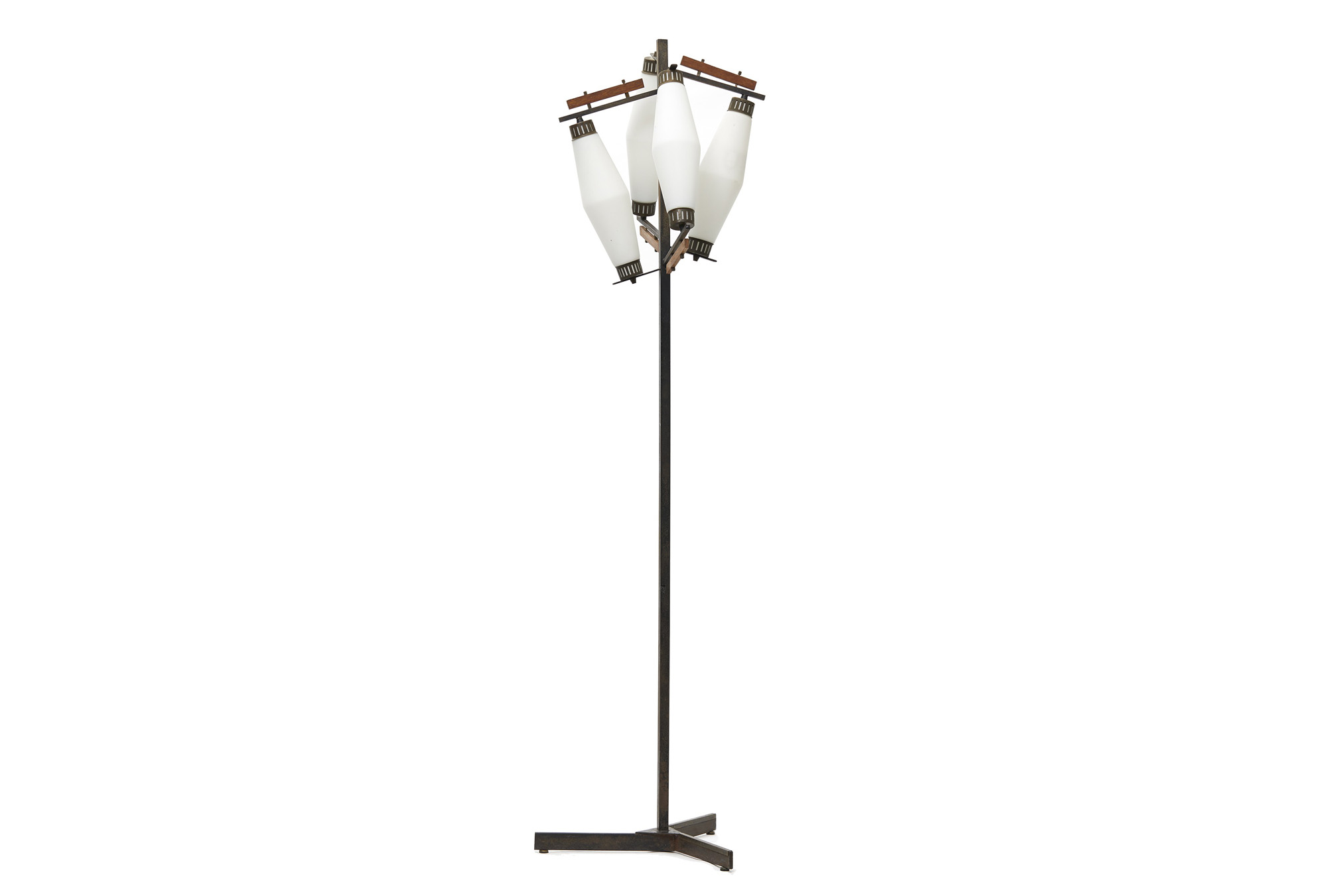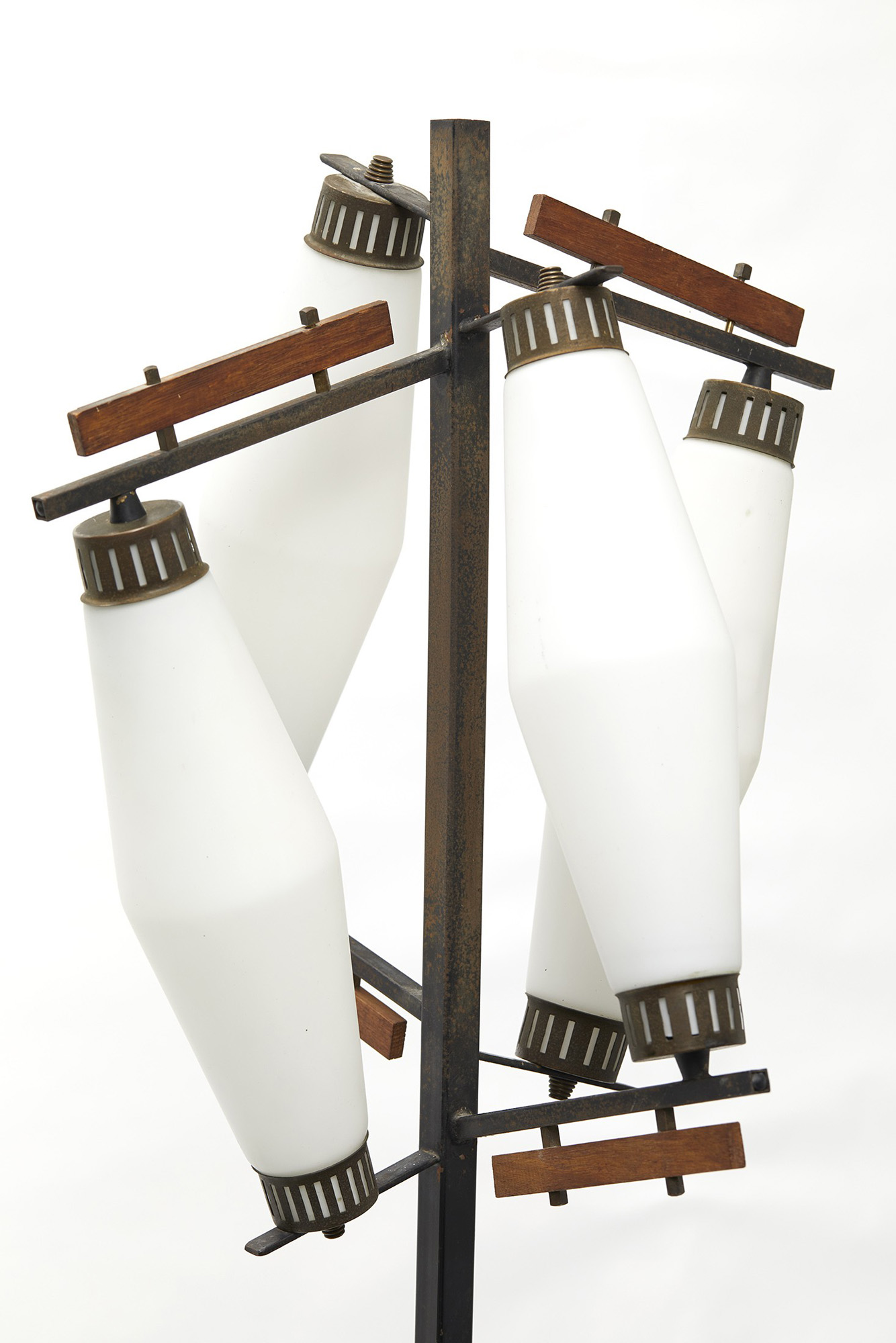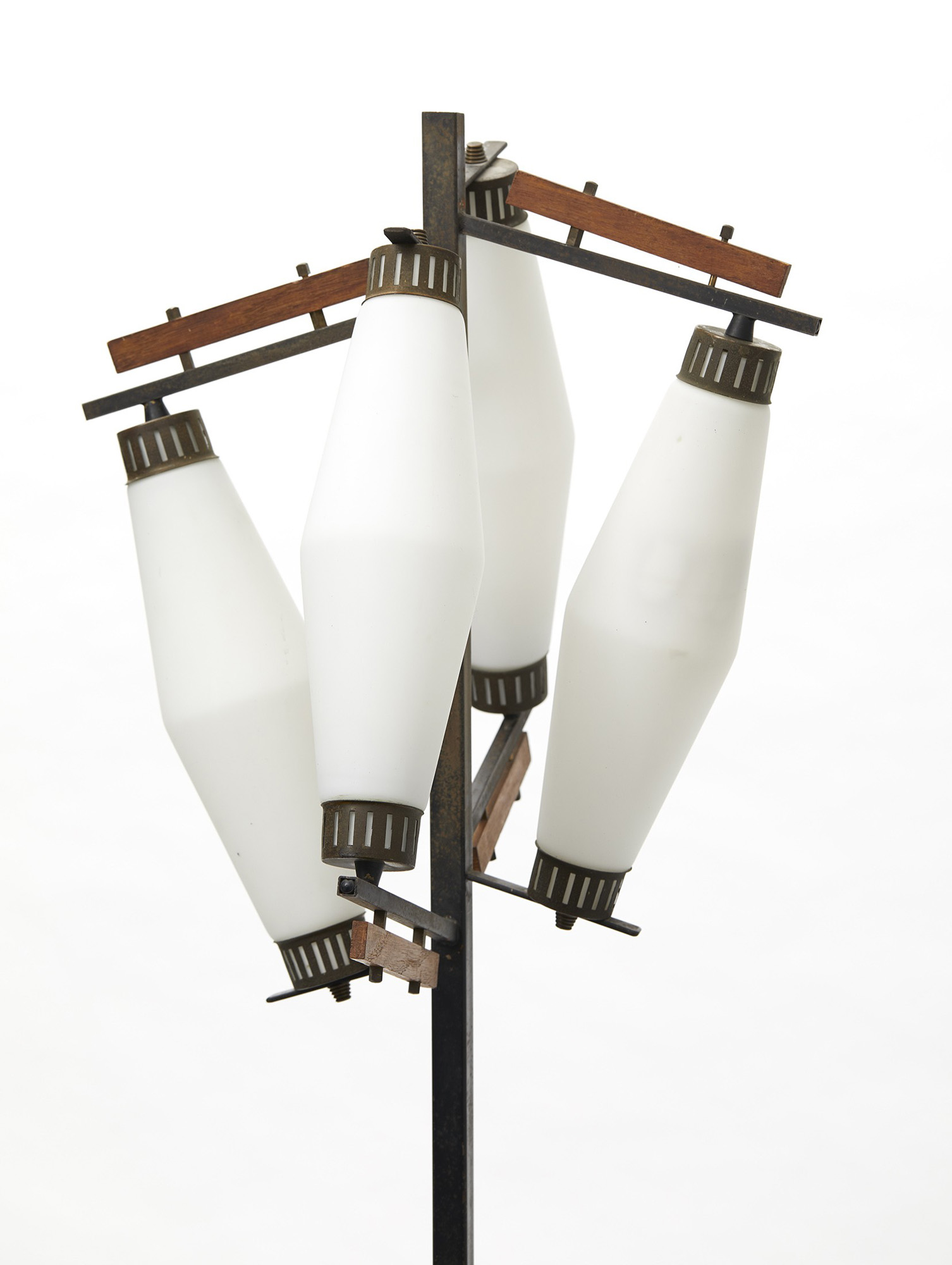 Lampada da terra a quattro luci con struttura in metallo laccato e diffusori in vetro opalino.