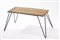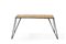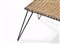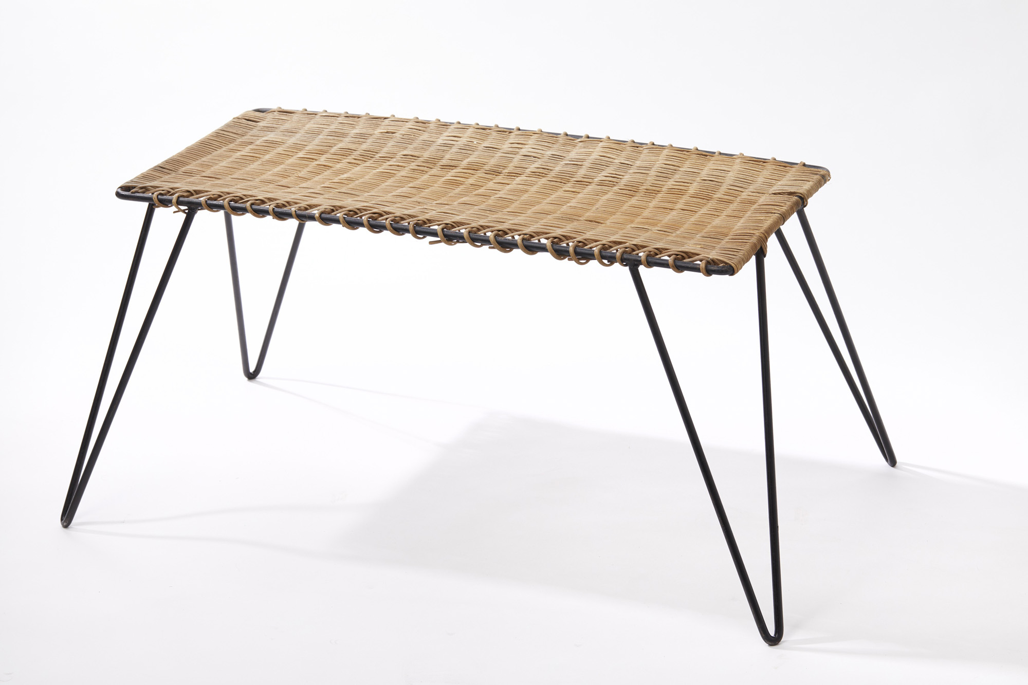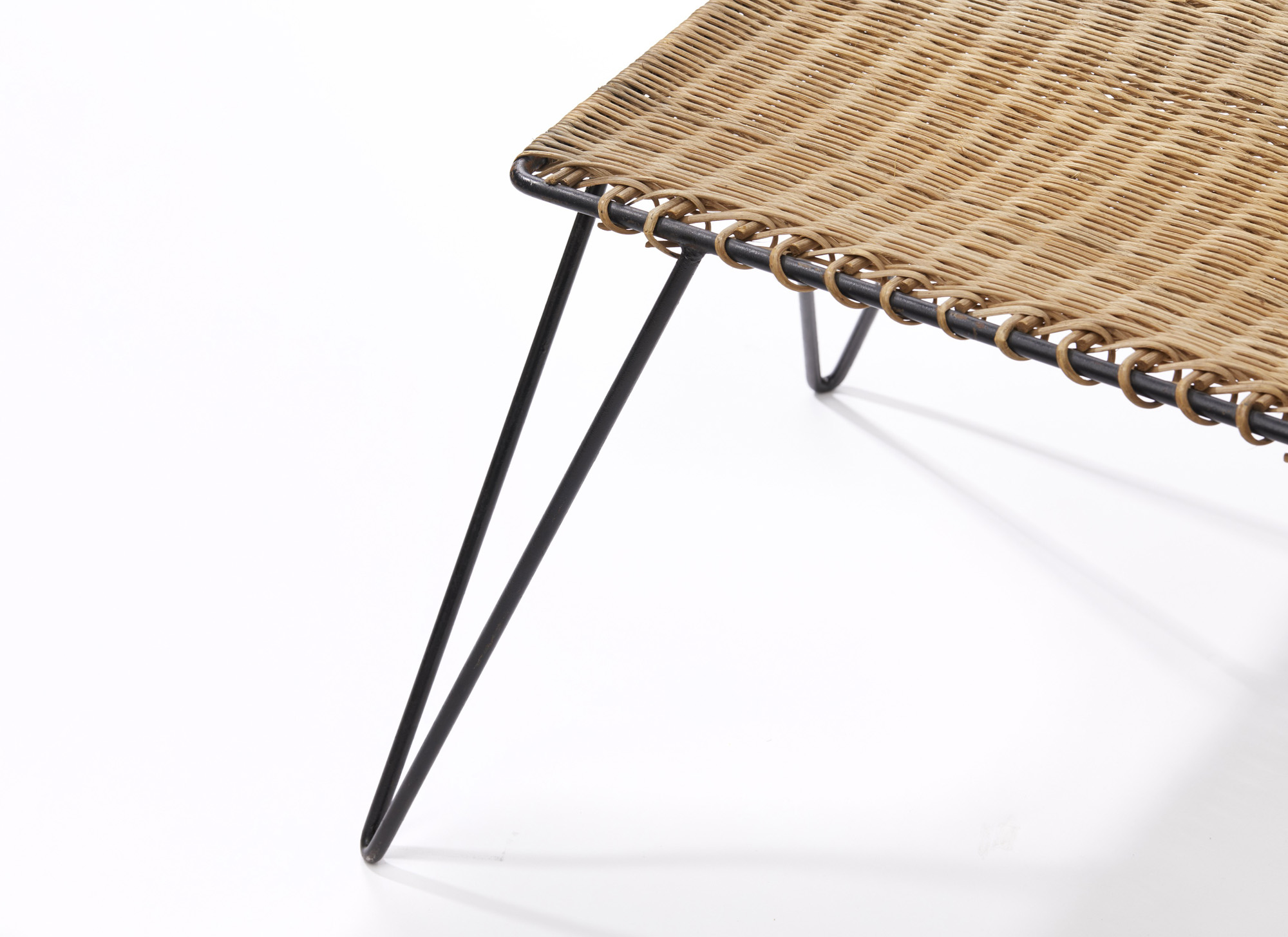 Tavolino con particolari gambe a V in metallo laccato nero, il piano del tavolino è in rattan.