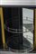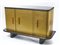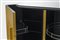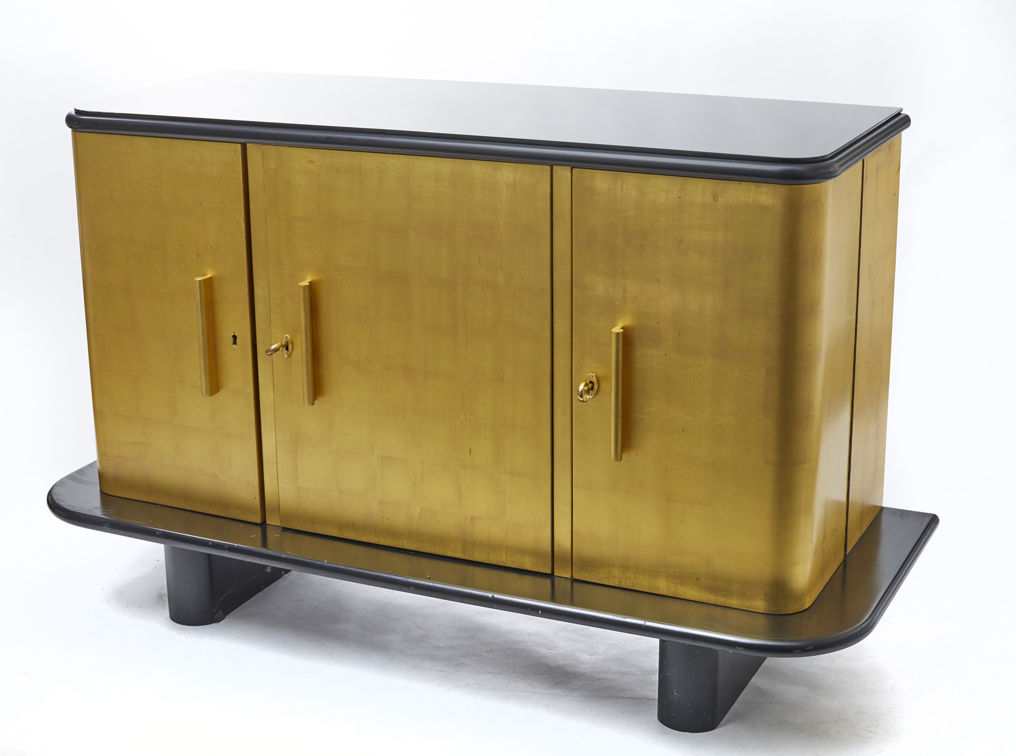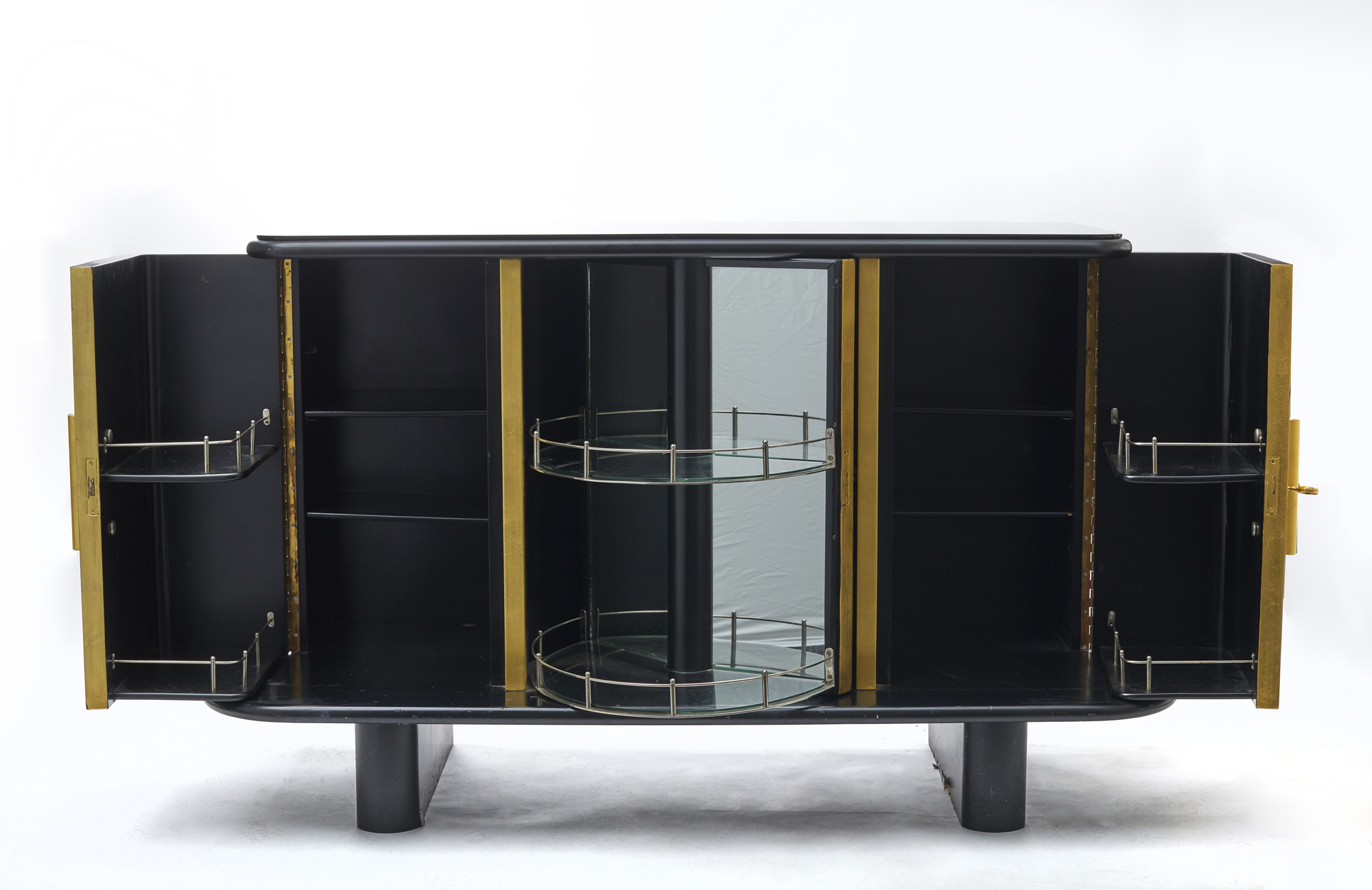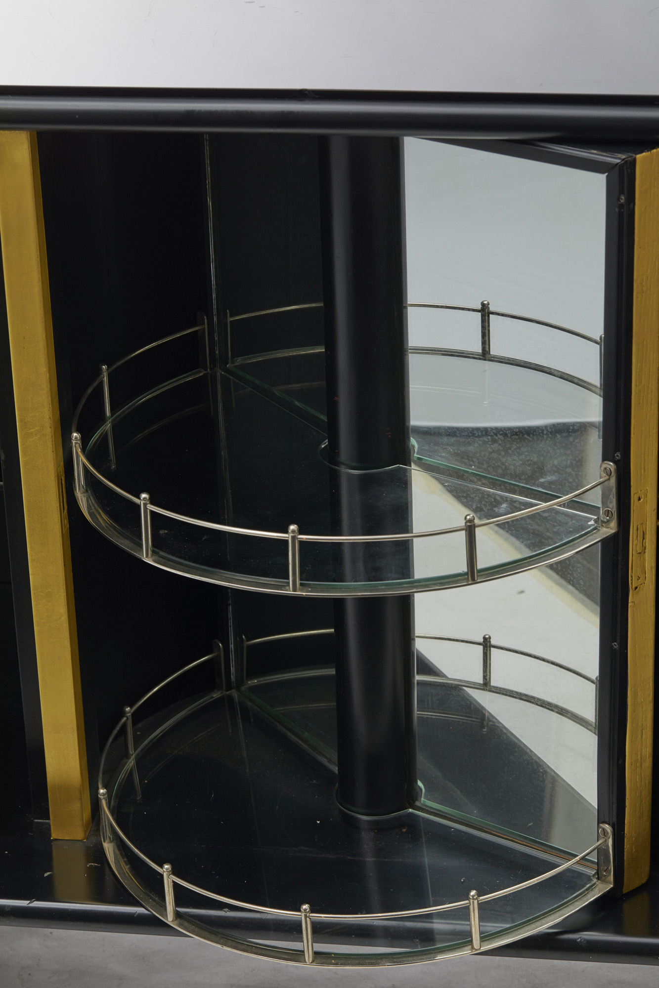 Mobile bar in legno laccato nero e oro, con piano in vetro.