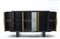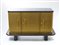 Il mobile presenta tre ante: l'anta centrale, all'interno, ha specchi e un portabottiglie a motivo circolare mentre le ante laterali presentano ripiani portabicchieri angolari.