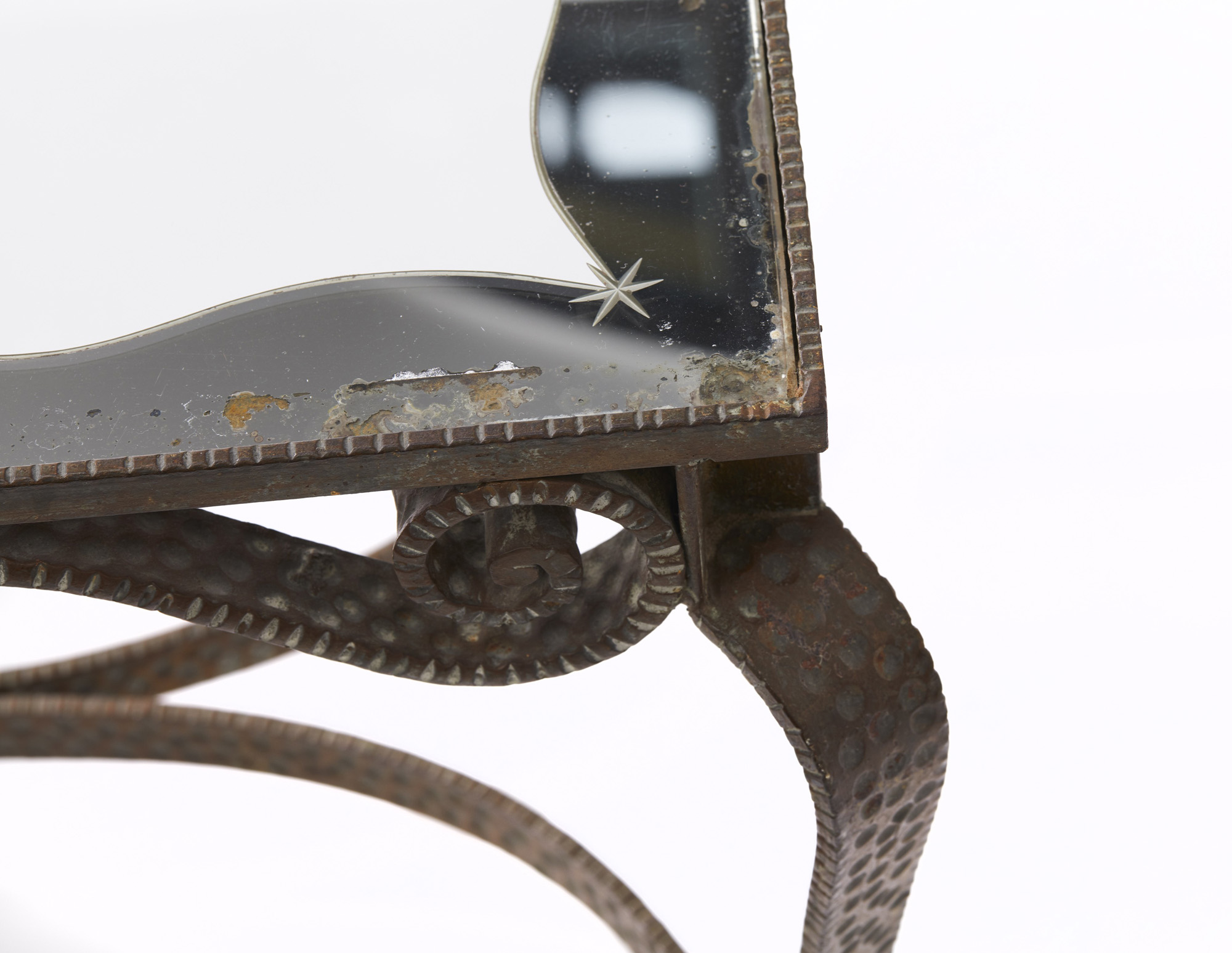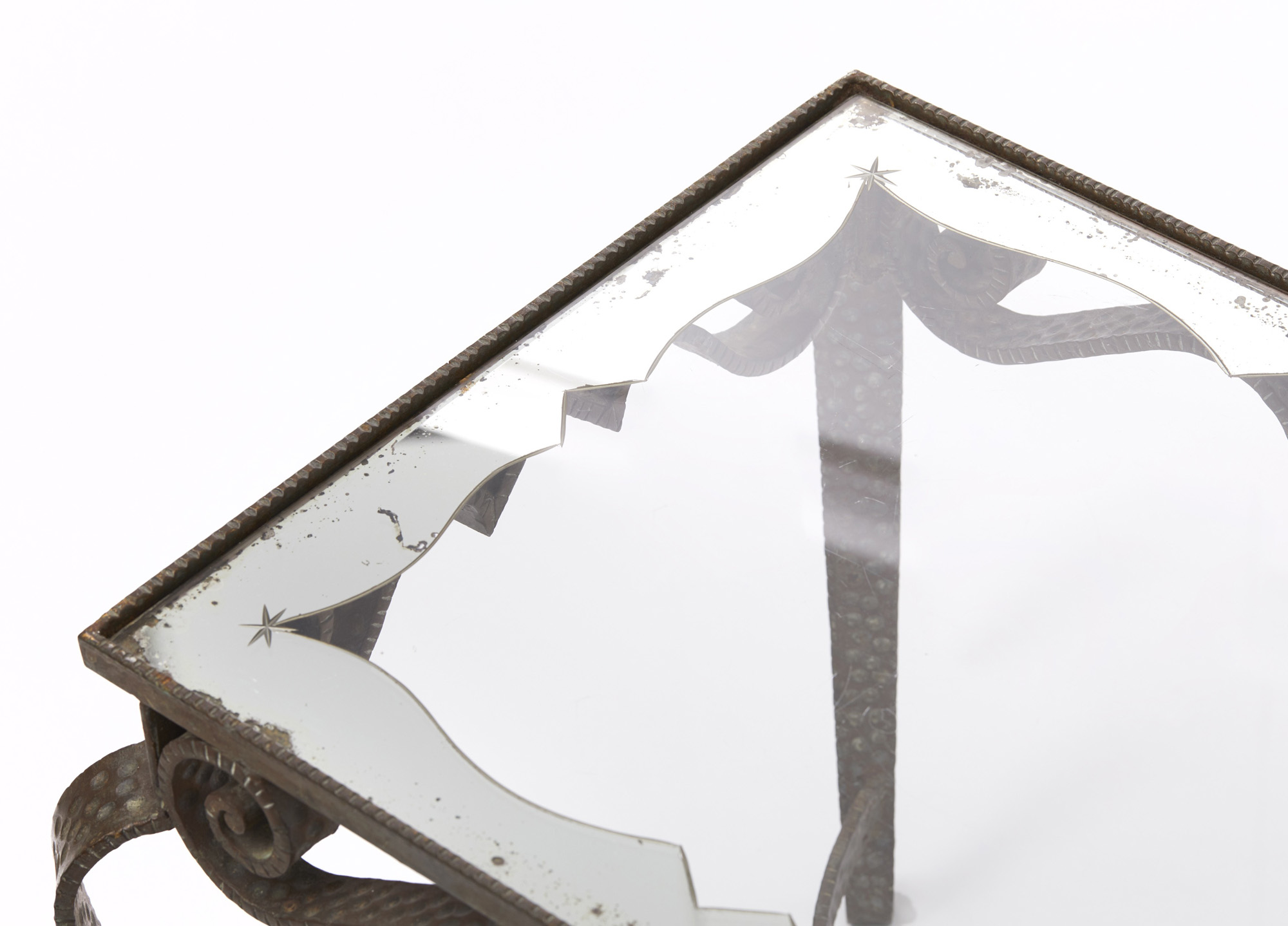 Tavolino con struttura in ferro battuto dorato a motivo di riccioli e gambe mosse attribuito alla manifattura Colli; il piano a incastro è in cristallo con decorazioni a specchio nel perimetro.