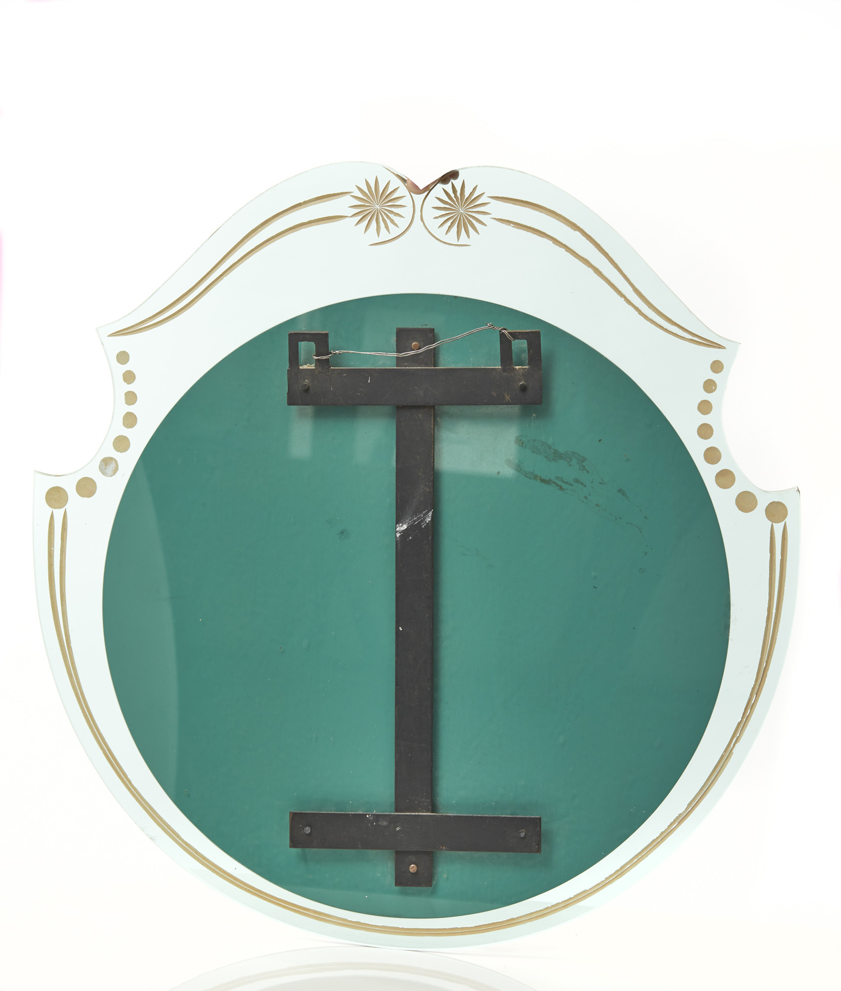 Specchio in cristallo molato di colore verde con decorazioni incise sulla cimasa e sui lati.