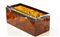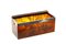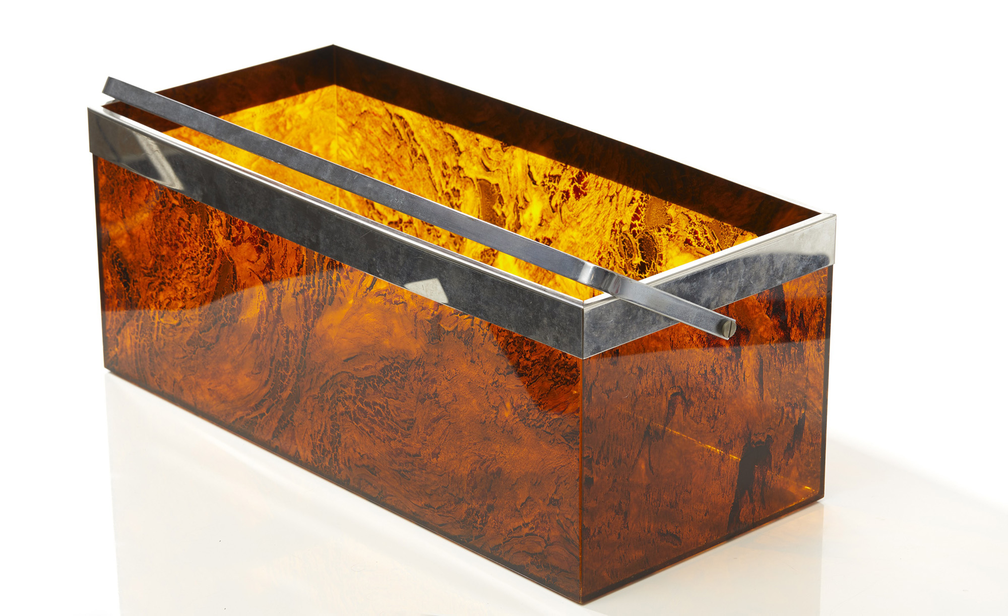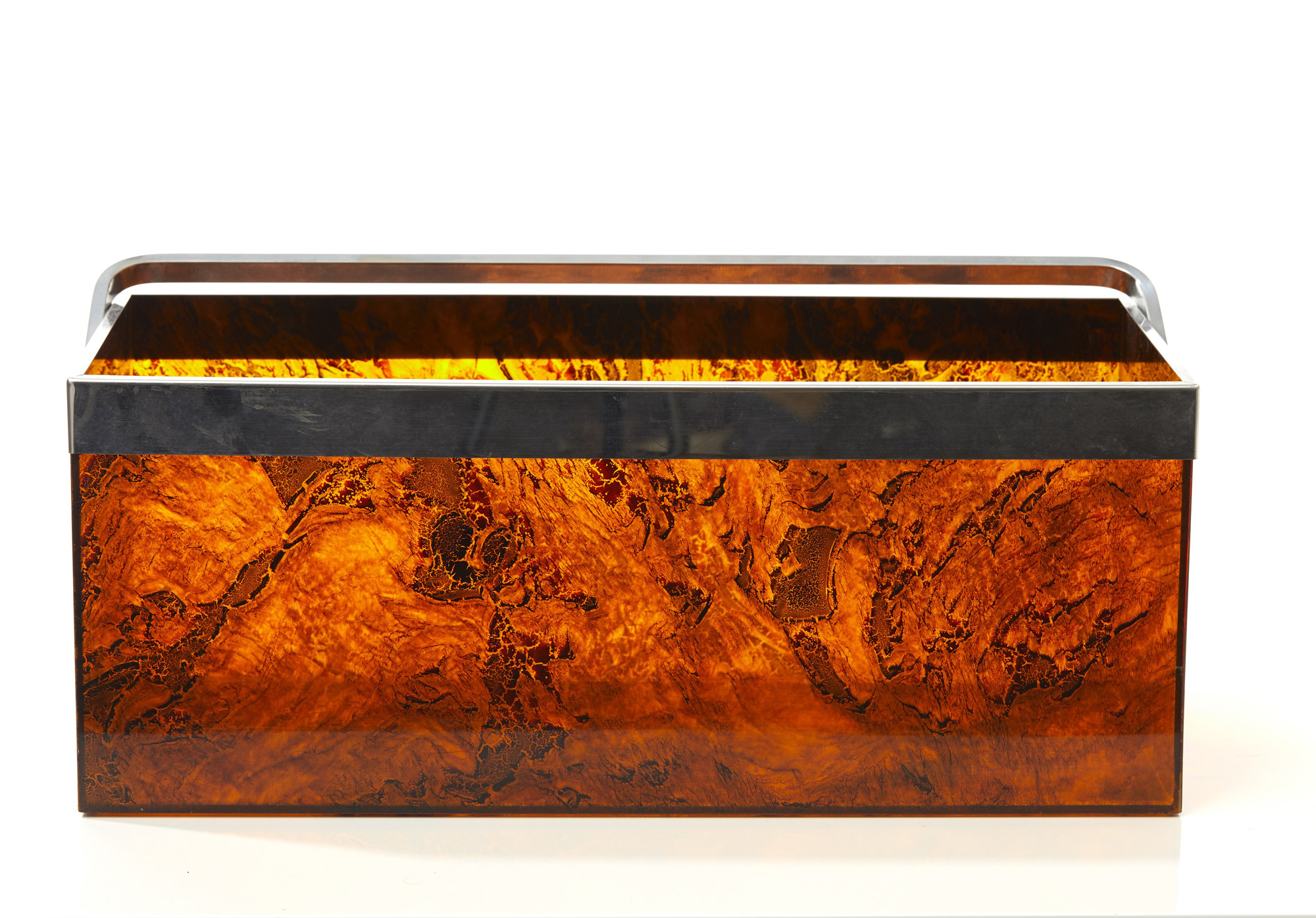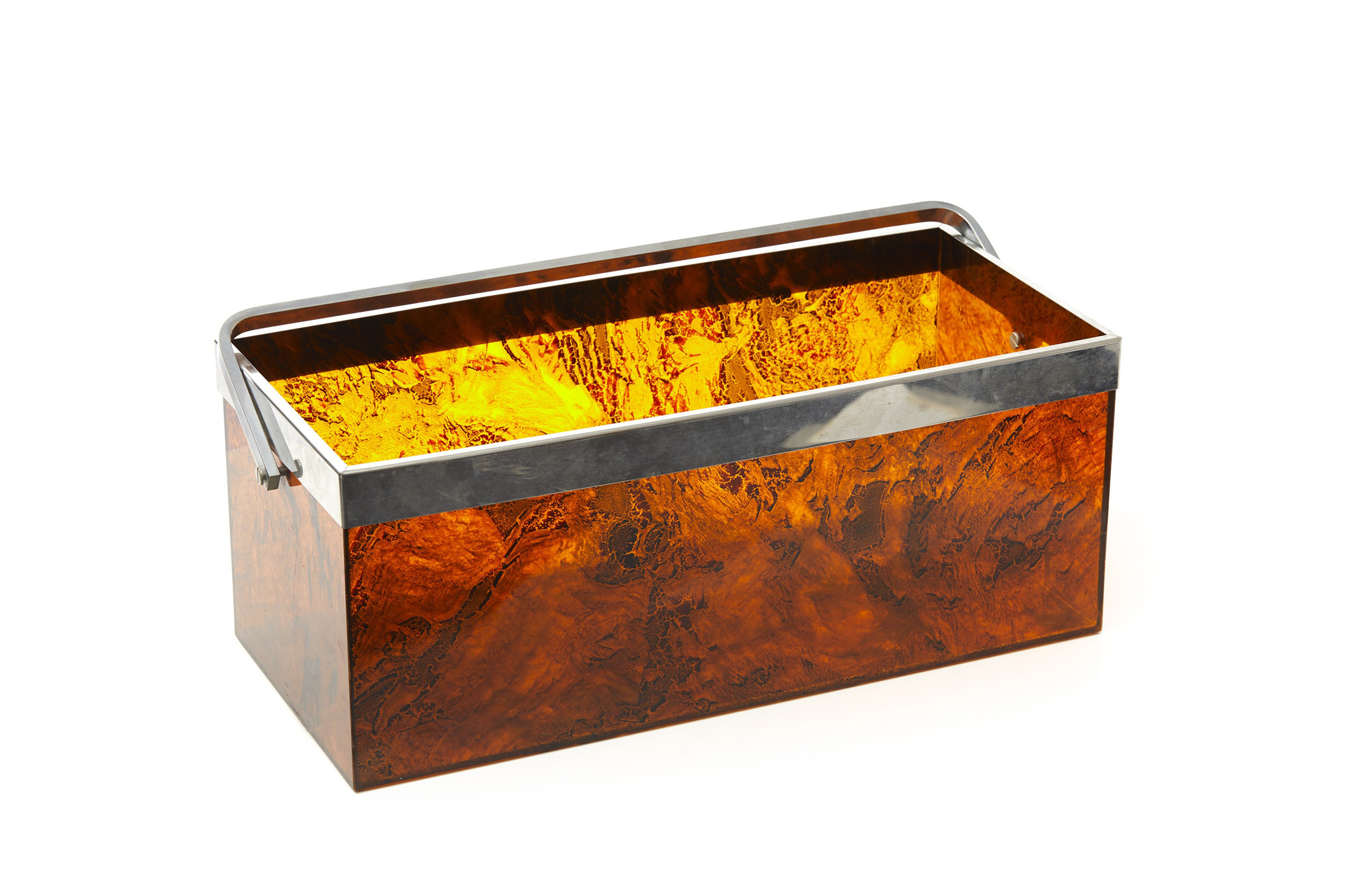 Contenitore portariviste di forma rettangolare in plexiglass color ambra, bordo e maniglia in metallo cromato.