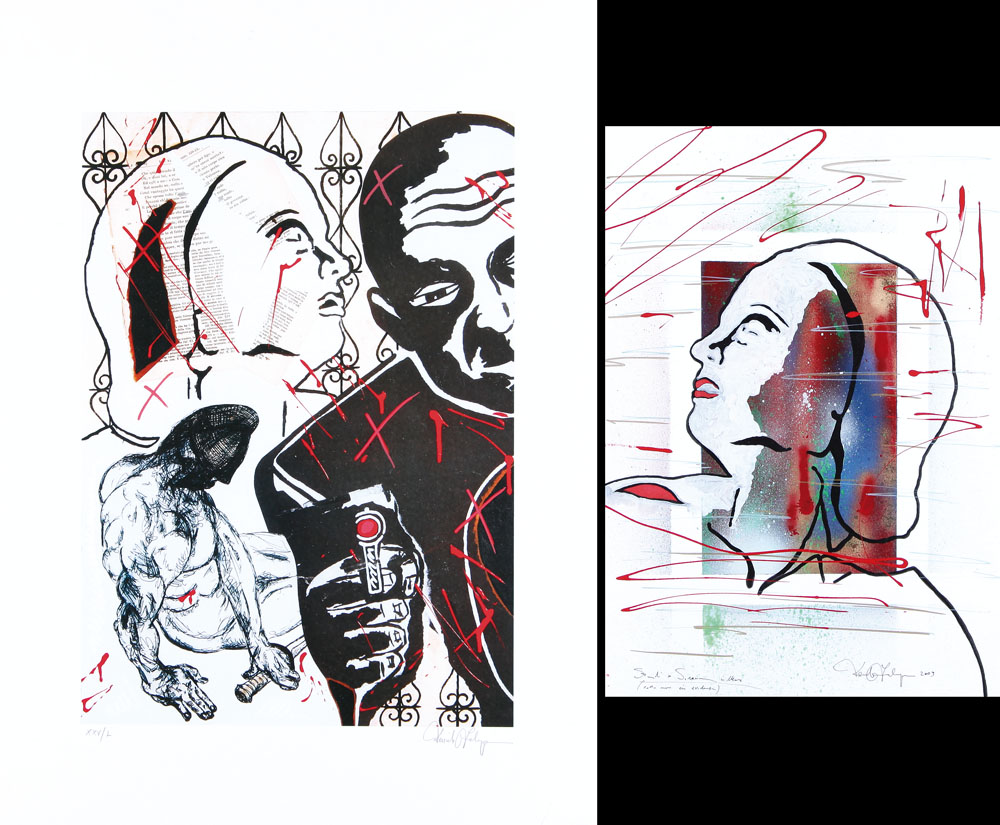 DANIELE FALANGA Messina 30/01/1974 Studio per sirena in mare, 2009 tecnica mista su carta cm. 48x33, firma e anno in basso a destra, titolo in basso a sinistra, dichiarazione d'autenticità dell'artista su foto, fotografie ritraente l'artista e l'opera allegata. Sagome serigrafia su carta cm. 70x50, esemplare XXV/L, firma in basso a destra, con intervento dell'artista.
