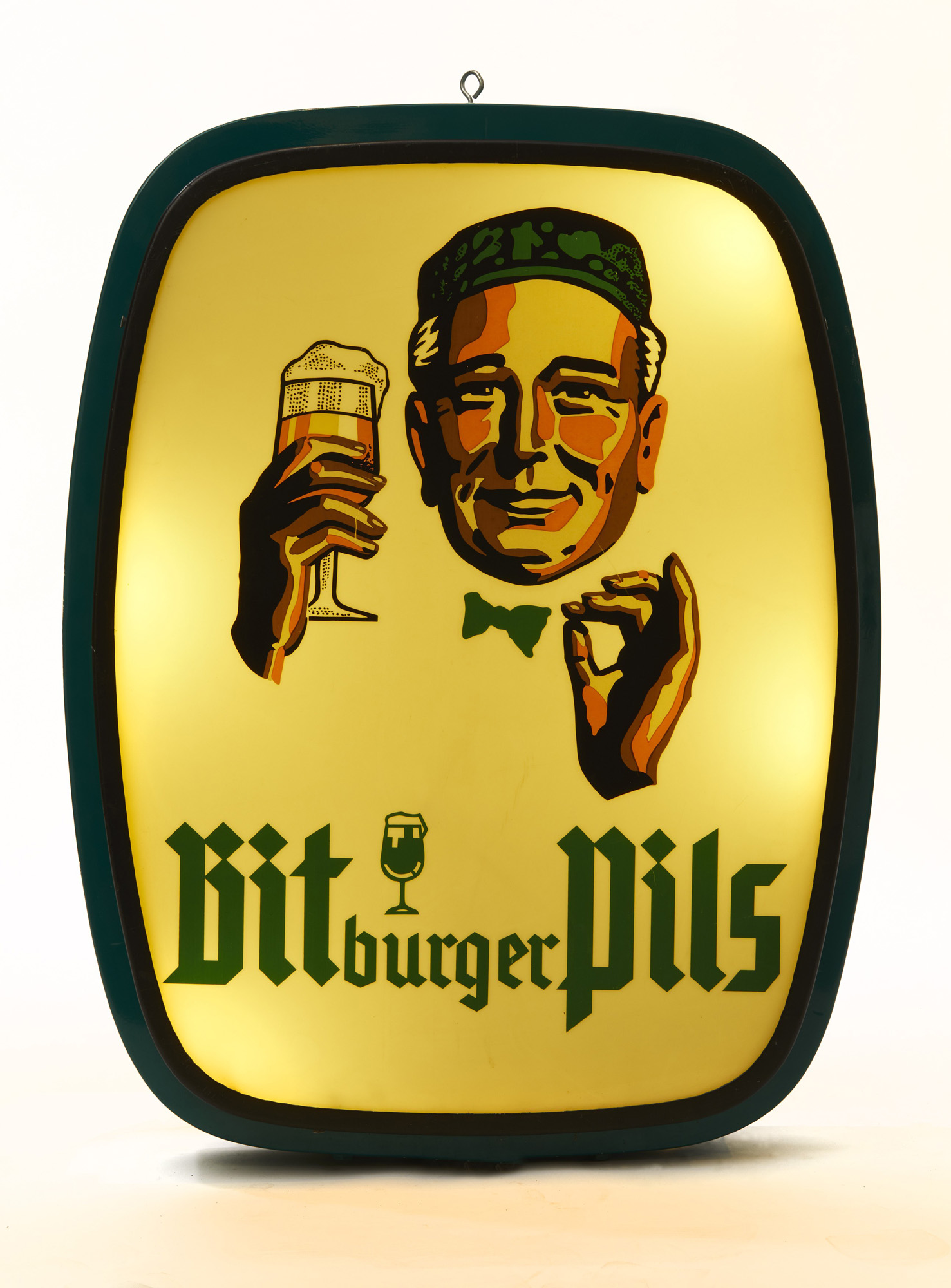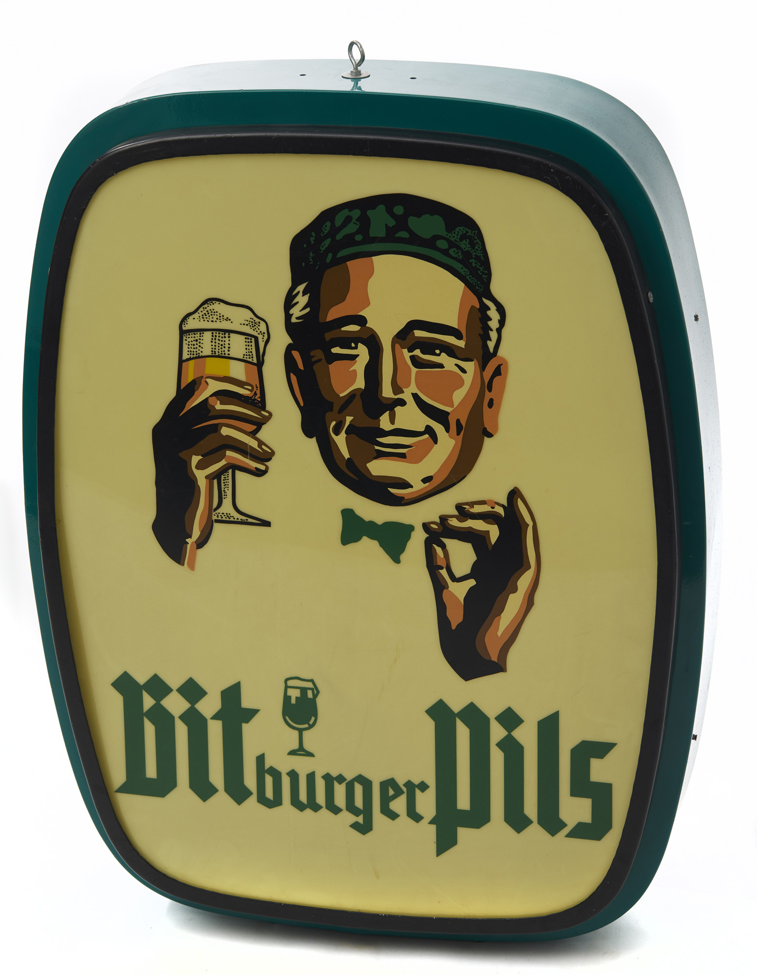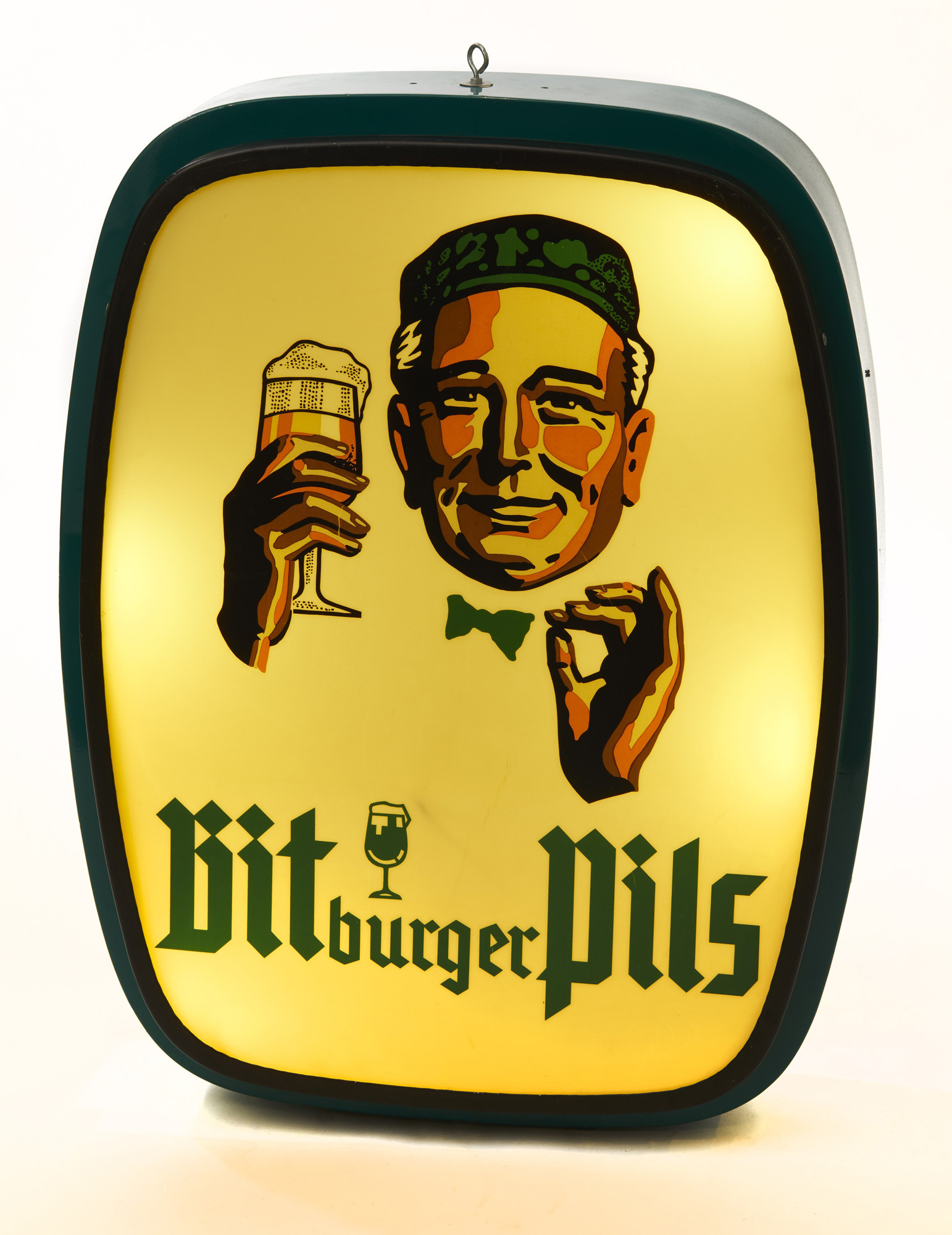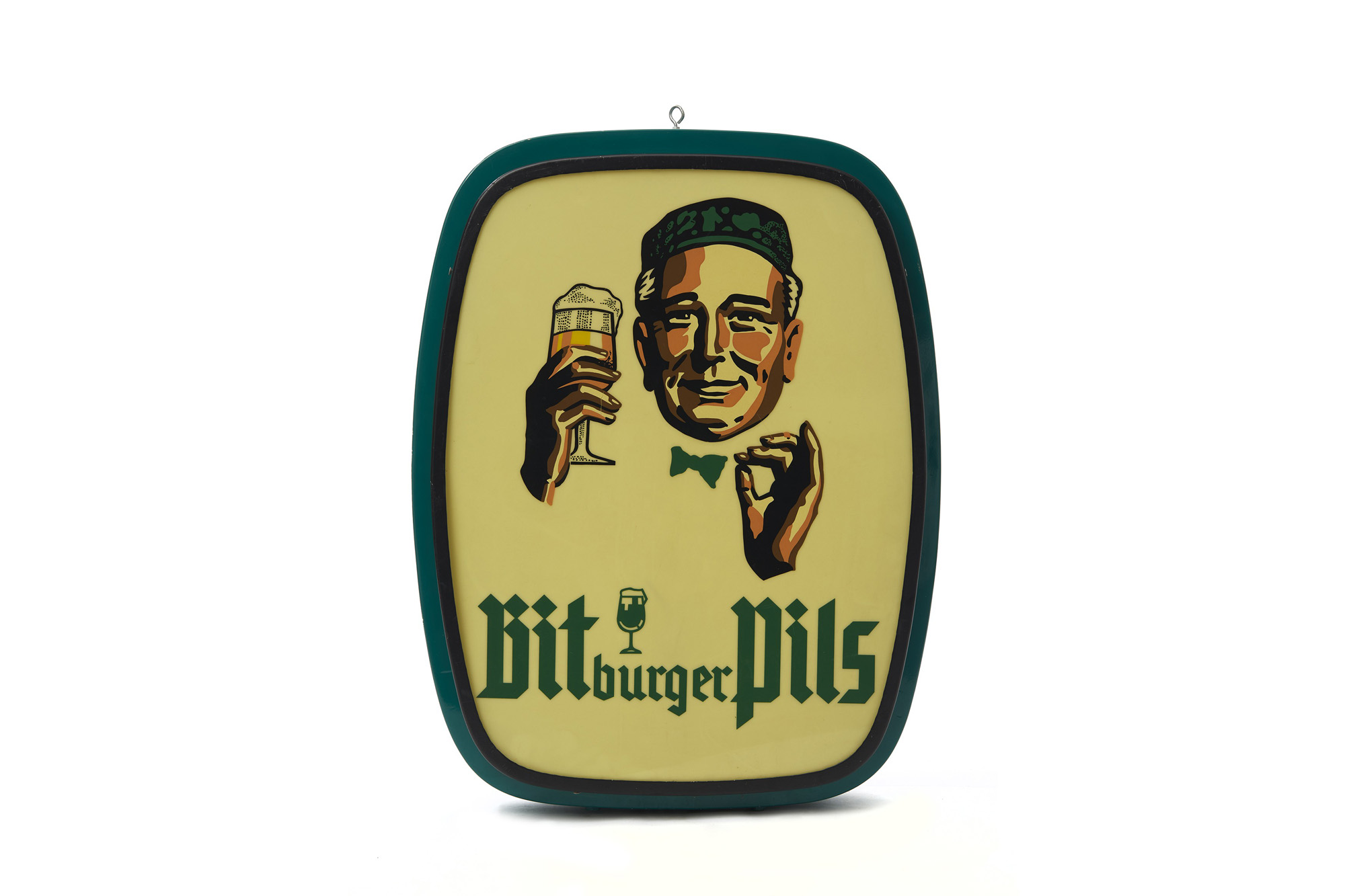 Insegna luminosa pubblicitaria da pub "Bitburger Pils" con telaio in metallo e struttura in pvc.