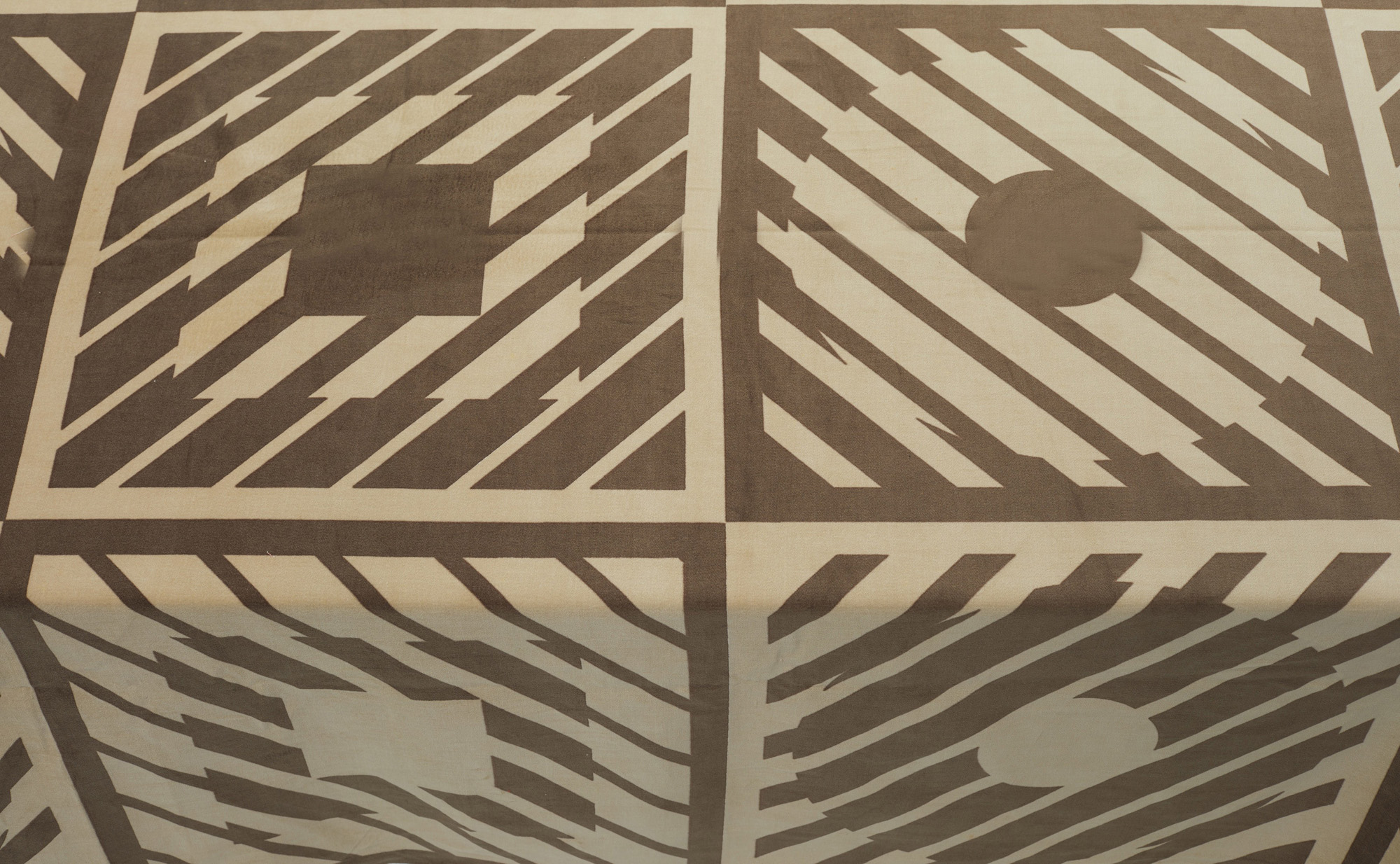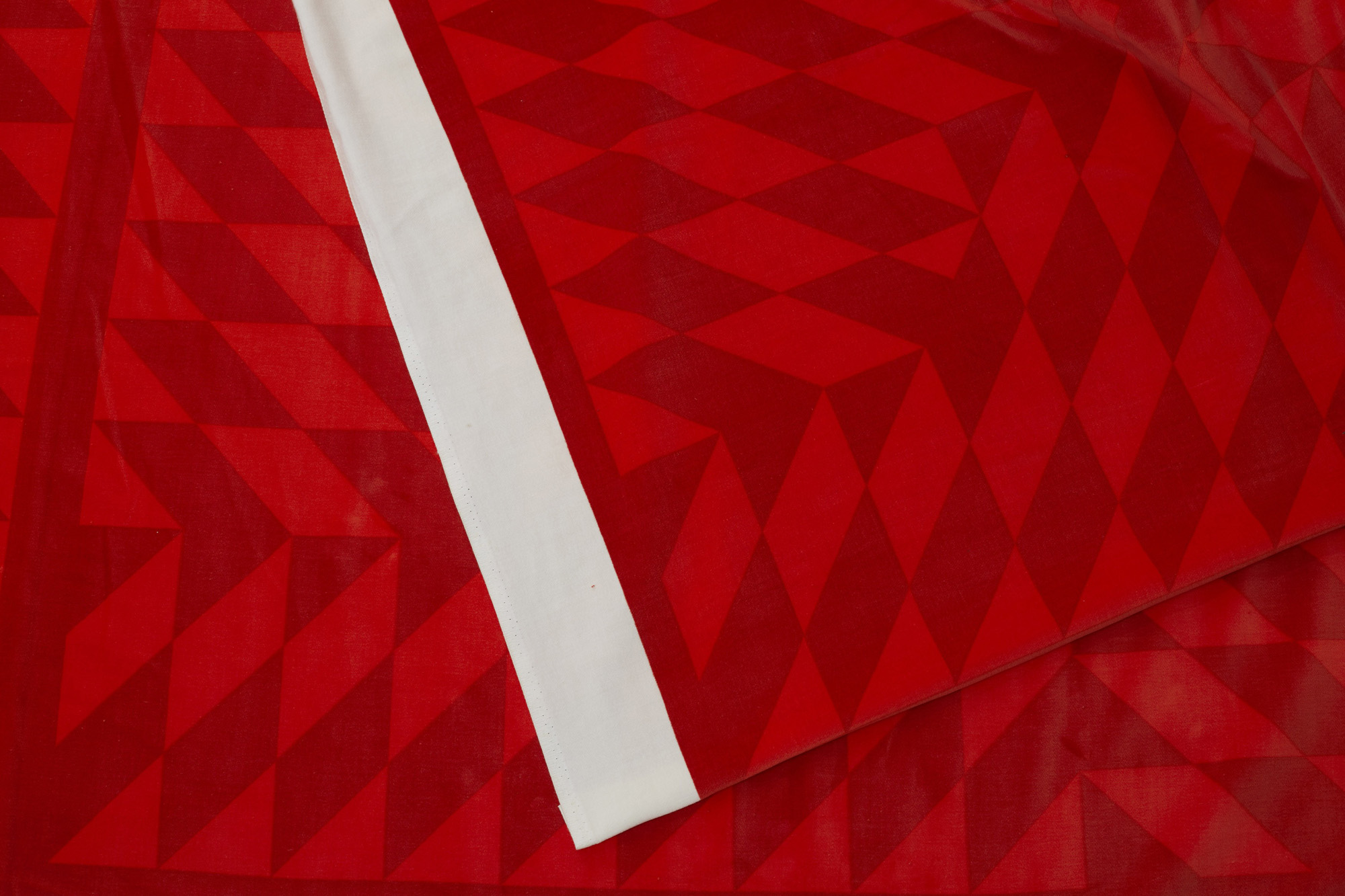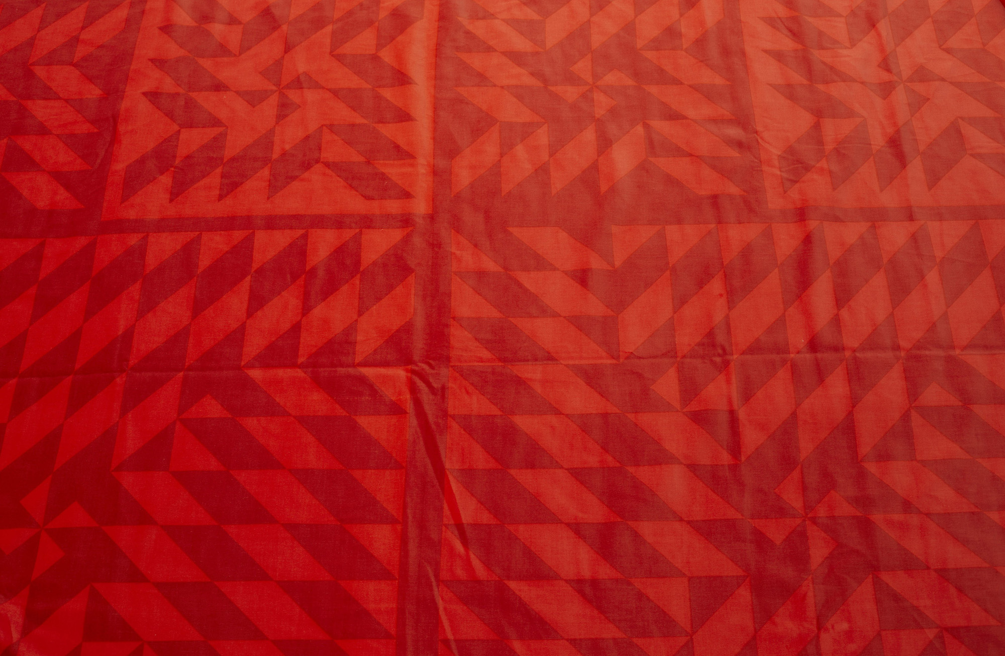 Tessuto attribuito alla manifattura di Ross F. Littell, in velluto di cotone stampato manualmente, disegni a riquadri geometrici nei toni del rosso scuro e del rosso chiaro.